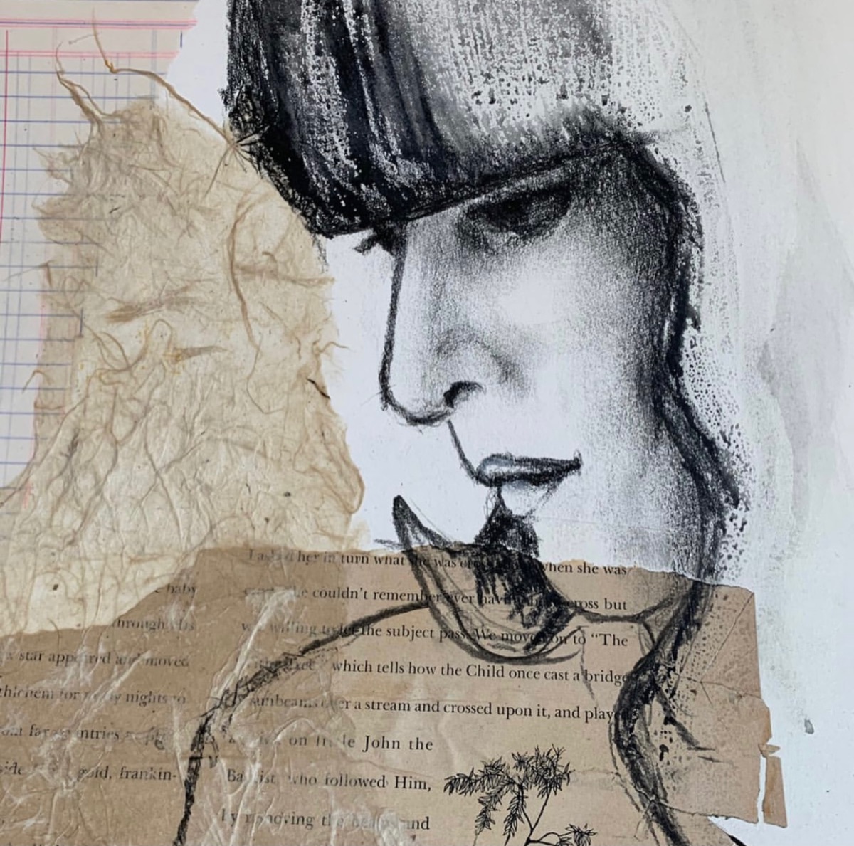 Charcoal and Collage on watercolor mounted on wood. 12" x 10"