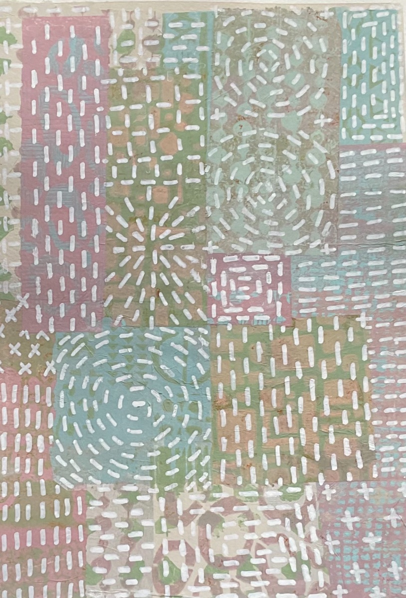Acrylic and paper collage. Reminiscent of Sashiko (刺し子, literally "little stabs") is a form of decorative reinforcement stitching. Traditionally this running stitch is used to reinforce points of wear or to repair tears with patches. Boro is the art of mending rags or scraps of cloth.