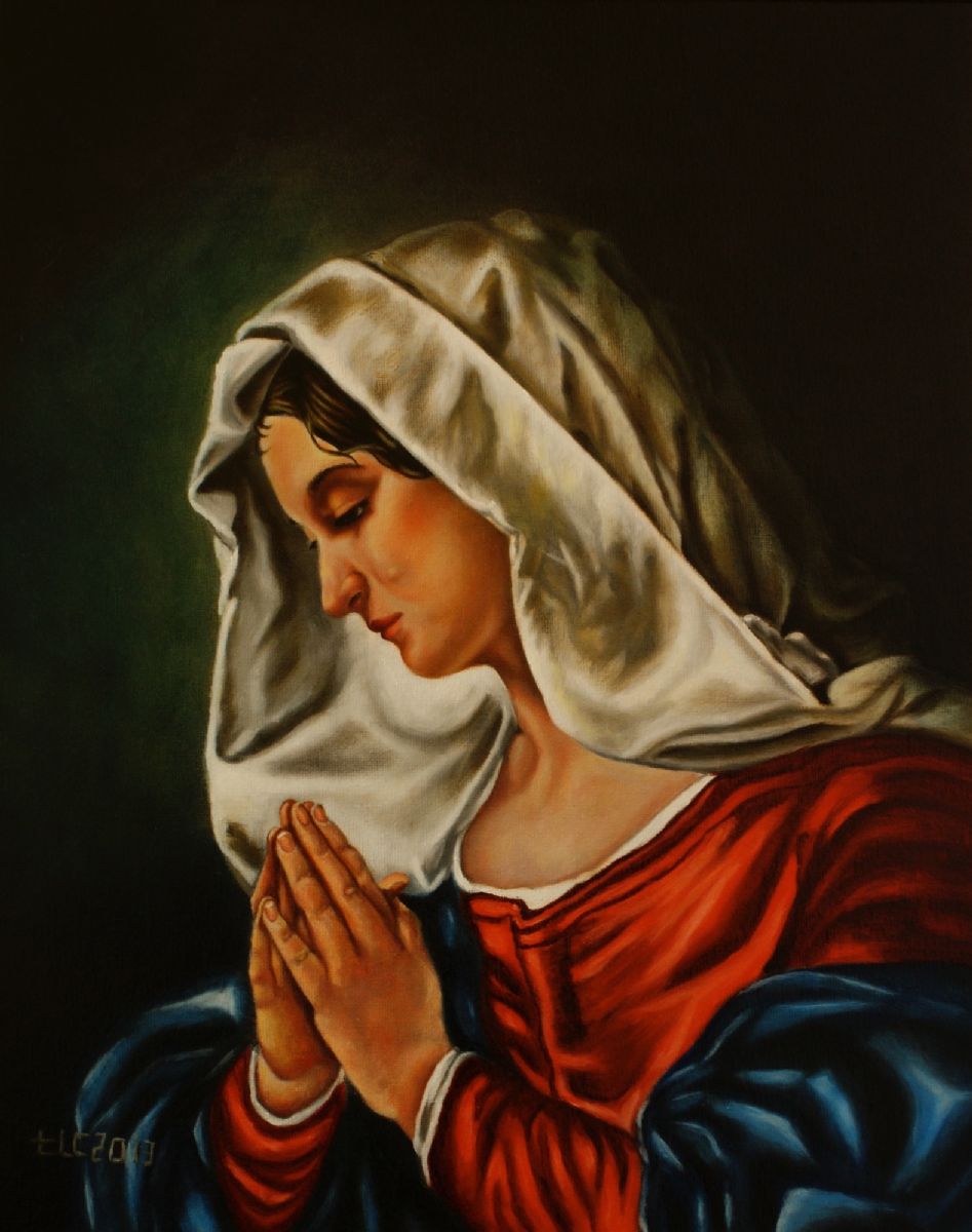 18x24 Oil on Canvas, Painting of the Blessed Mother in traditional royal colors. Painted in the style of the Old Masters.