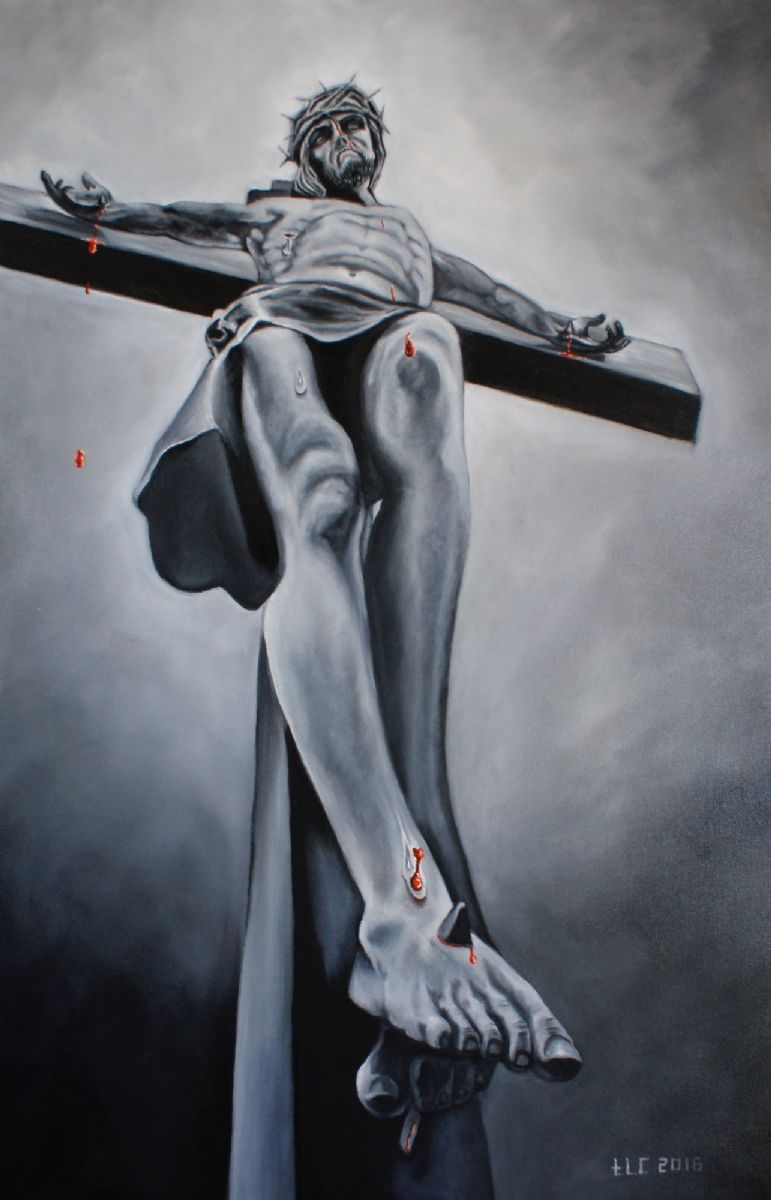 24x36, Oil on Canvas, Painted in Greyscale with limited color. Red only for Good Friday. Perspective is from the viewers ground level. Blood and water combination represents Jesus shedding blood for humanity and the water of baptism for cleansing.
