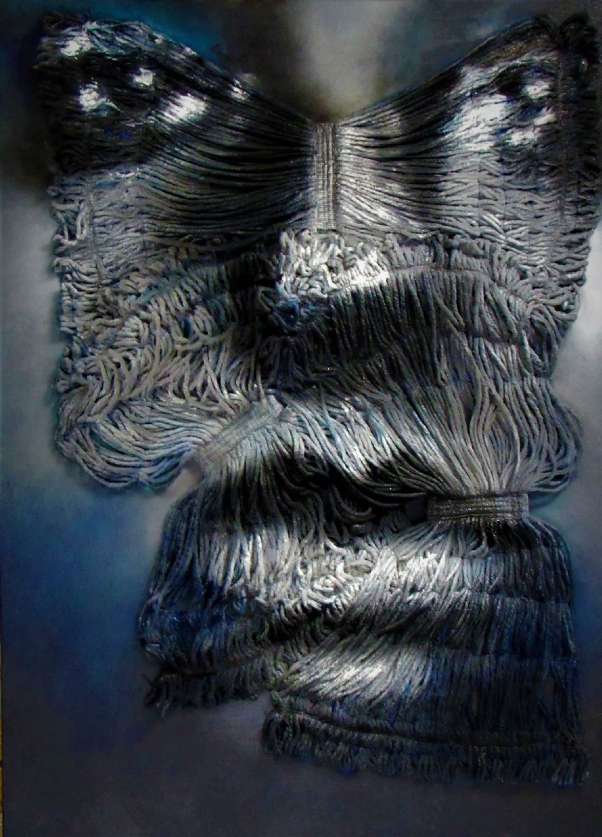mixed media - acrylic, upcycled mops from Black and Brown women custodians from Mayo Hospital, oil enamel spray paint, crochet thread on canvas