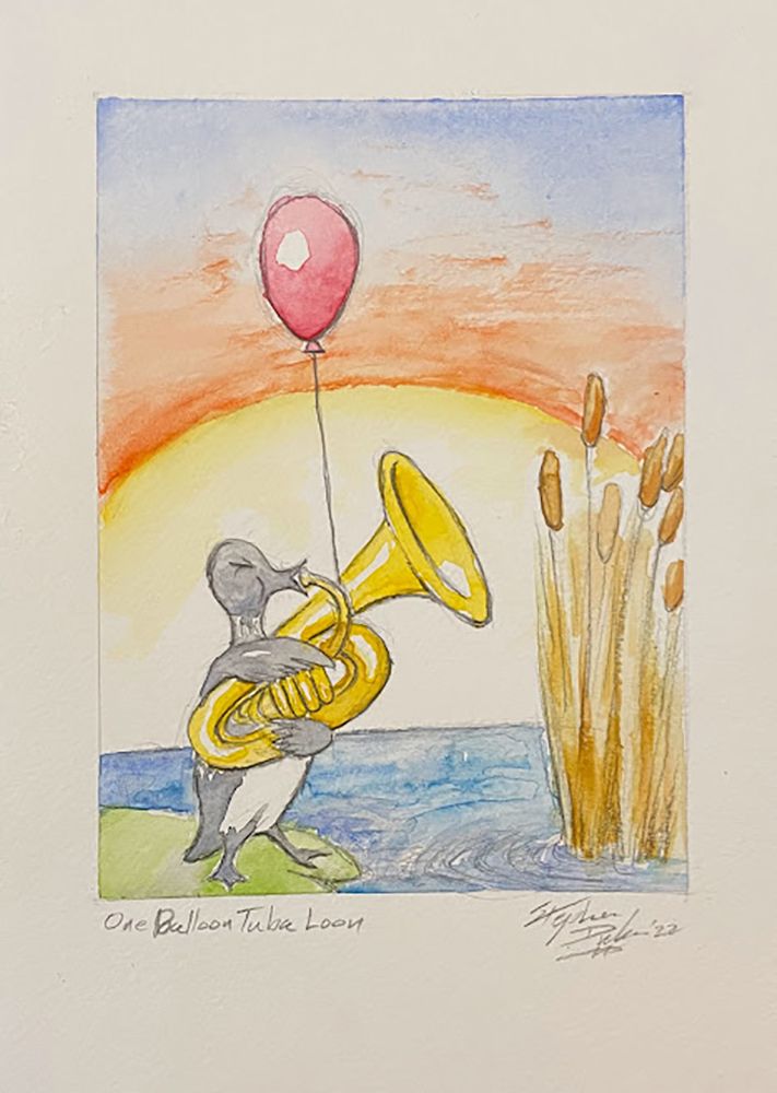 One Balloon Tuba Loon has its origins on a boring trip from Washington DC to New York in 2015. In need of any entertainment, I sketched a cartoon the concept of which was, "What is better than one balloon? Tuba loons!" This elicited from me a very audible giggle fit which afforded me a bit more room on the crowded bus (killing two birds and such).