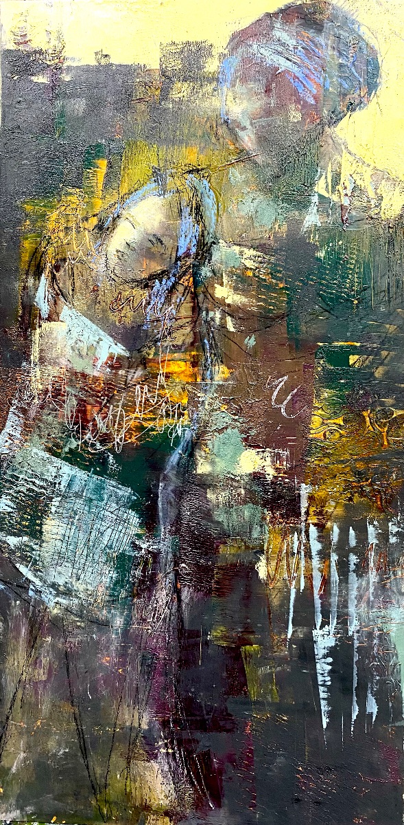 Oil and cold wax on panel. Layers beneath, drawings and marks, variations in color, until the narrative emerges.