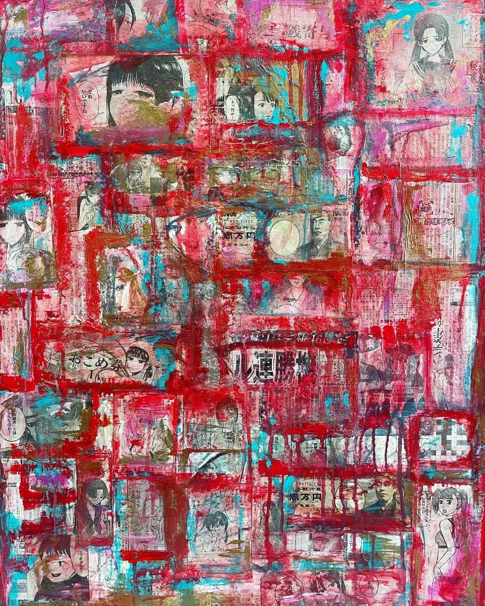 TOKYO is a celebration of, well, Tokyo. I spent a few weeks there recently and fell head over heels in love with that city. I brought all the materials for this collage in Japan during that visit. This piece showcases the Japanese aesthetic, incorporating manga and highlights from the red-light district of Tokyo.