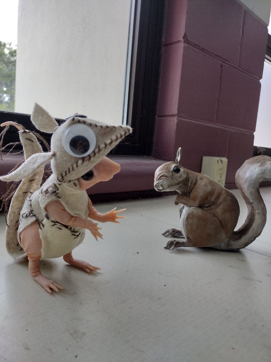 A rat trying to be a squirrel in his homemade squirrel costume.