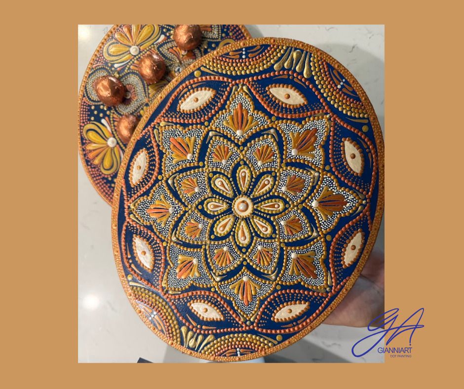 Wooden tray with metal stoppers, dot painted in stardust rhythm. Created to hold the small wonders of daily life, a piece of sweetness, a moment of gratitude, a memory we choose to honor.