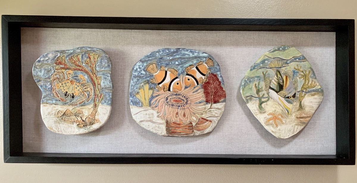 Hand made clay sculptures in relief form mounted into custom shadow box frame