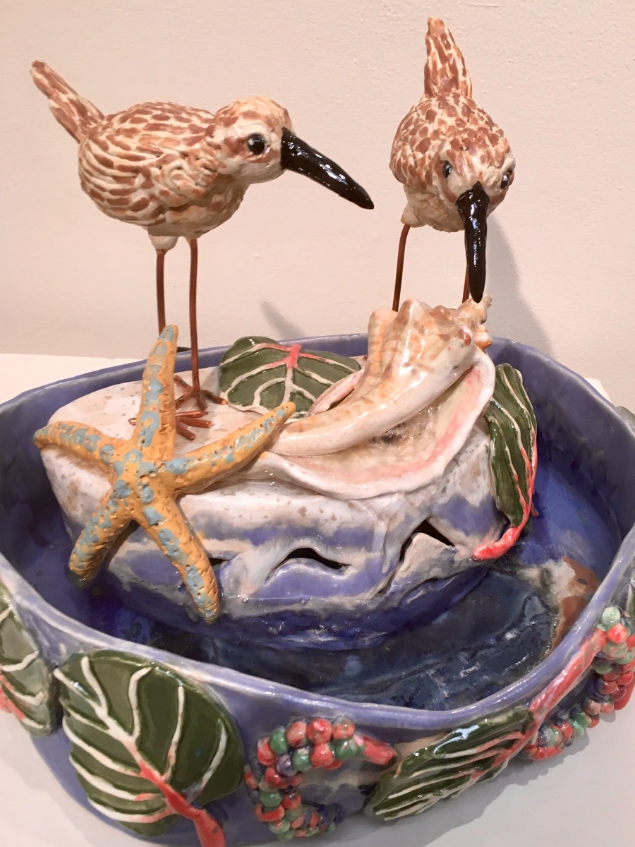 Art water fountain hand sculpted clay with copper legs and conch shell that gently pours water into the base vessel.