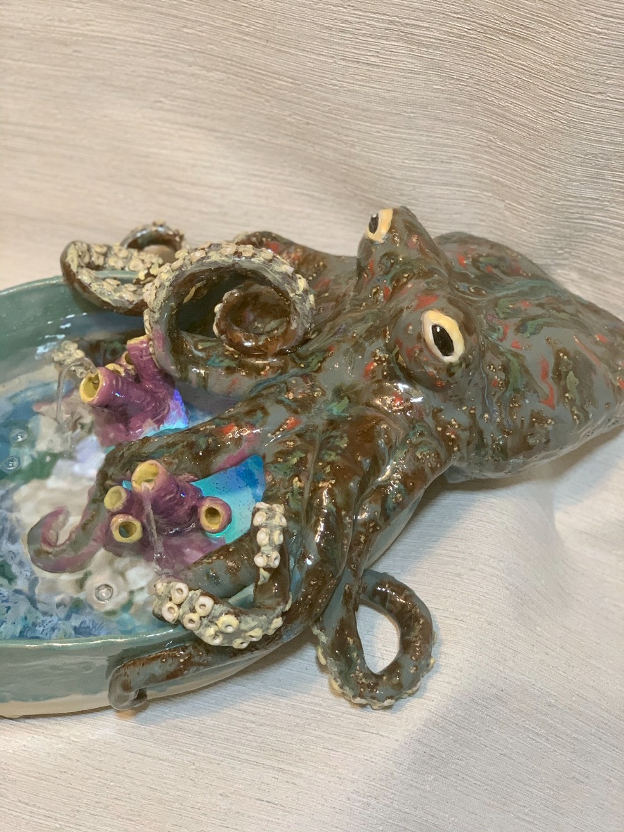 Hand sculpted art water fountain of an octopus slowly moving along to discover his new meal along the tropical sea floor.