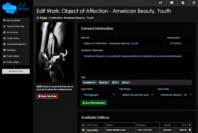 Limitlessly upload, organize, and track all of your artwork into collections known as folios. No more forgetting critical information such as titles, pricing, medium information, and other details. With Cloudfolios, your most critical information is available to you at anytime.