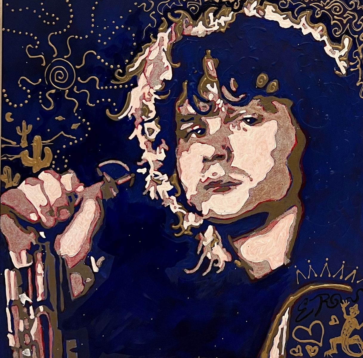 Acrylic, fabric slick paint and glitter on canvas, $500