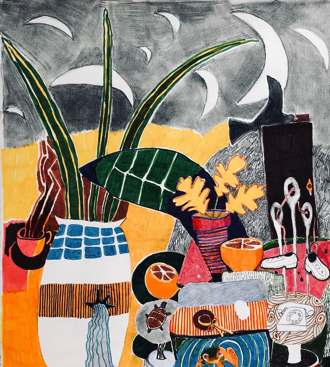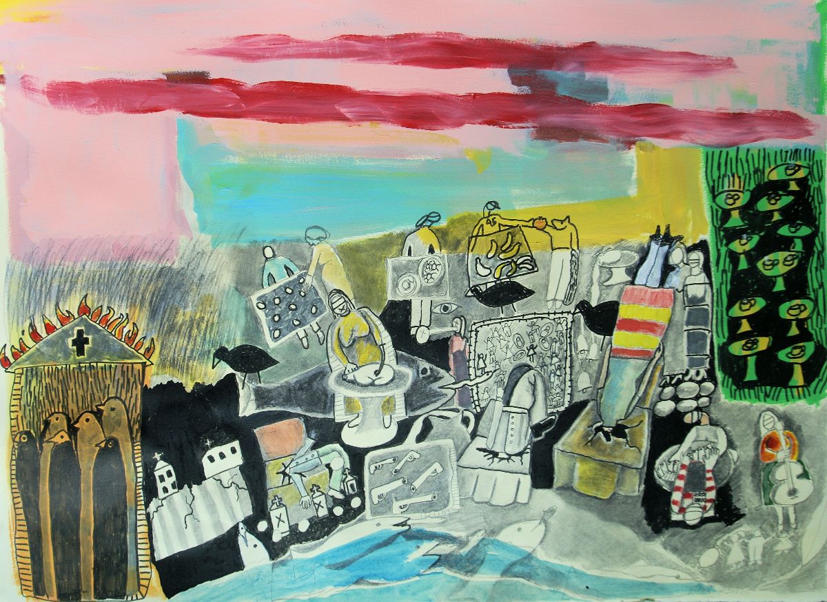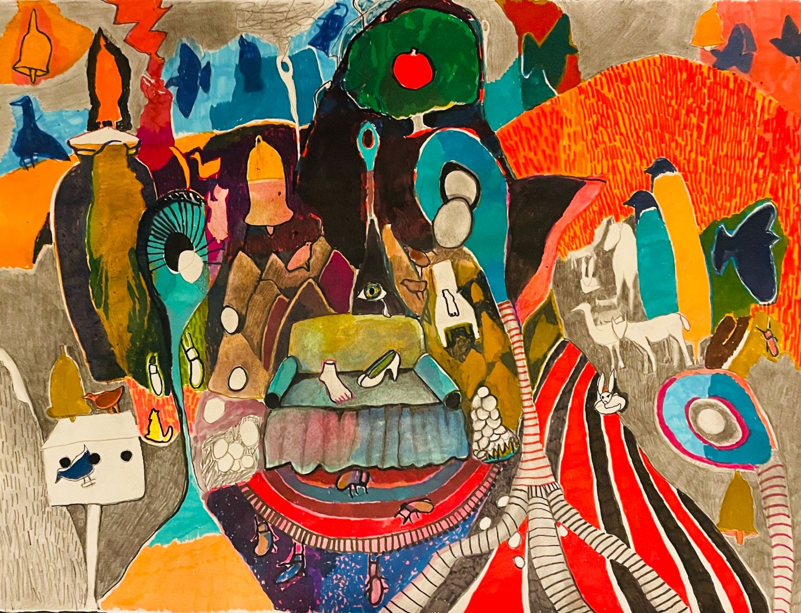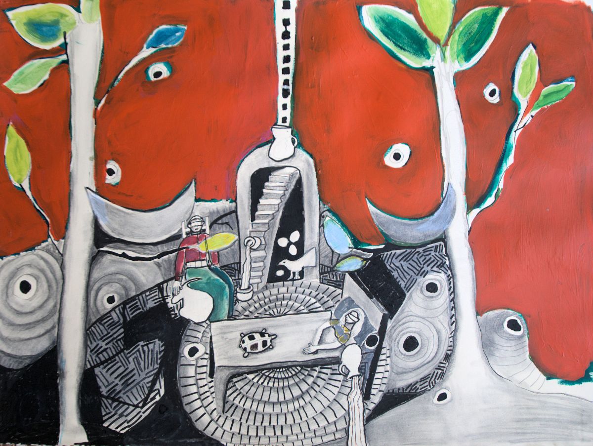 Acrylic, watercolor, pencil on rives paper, $1,000