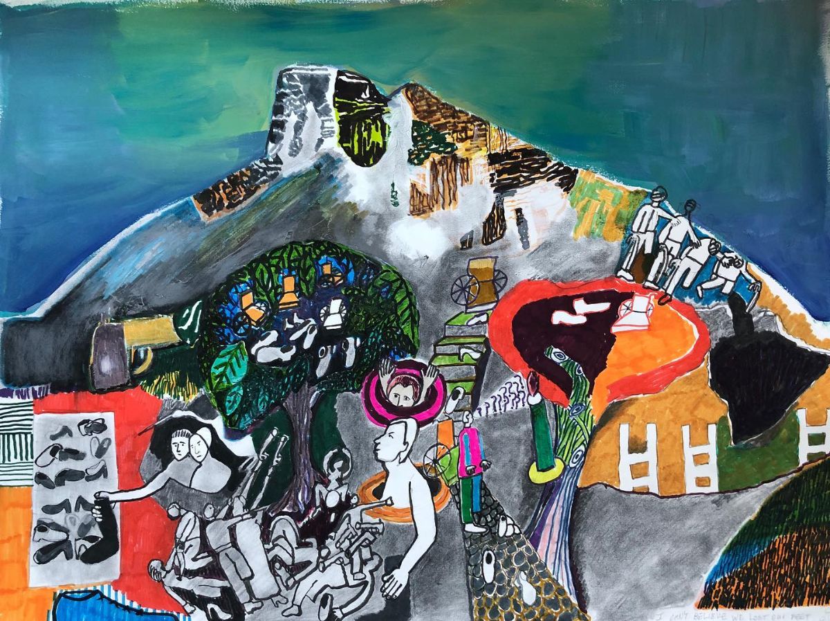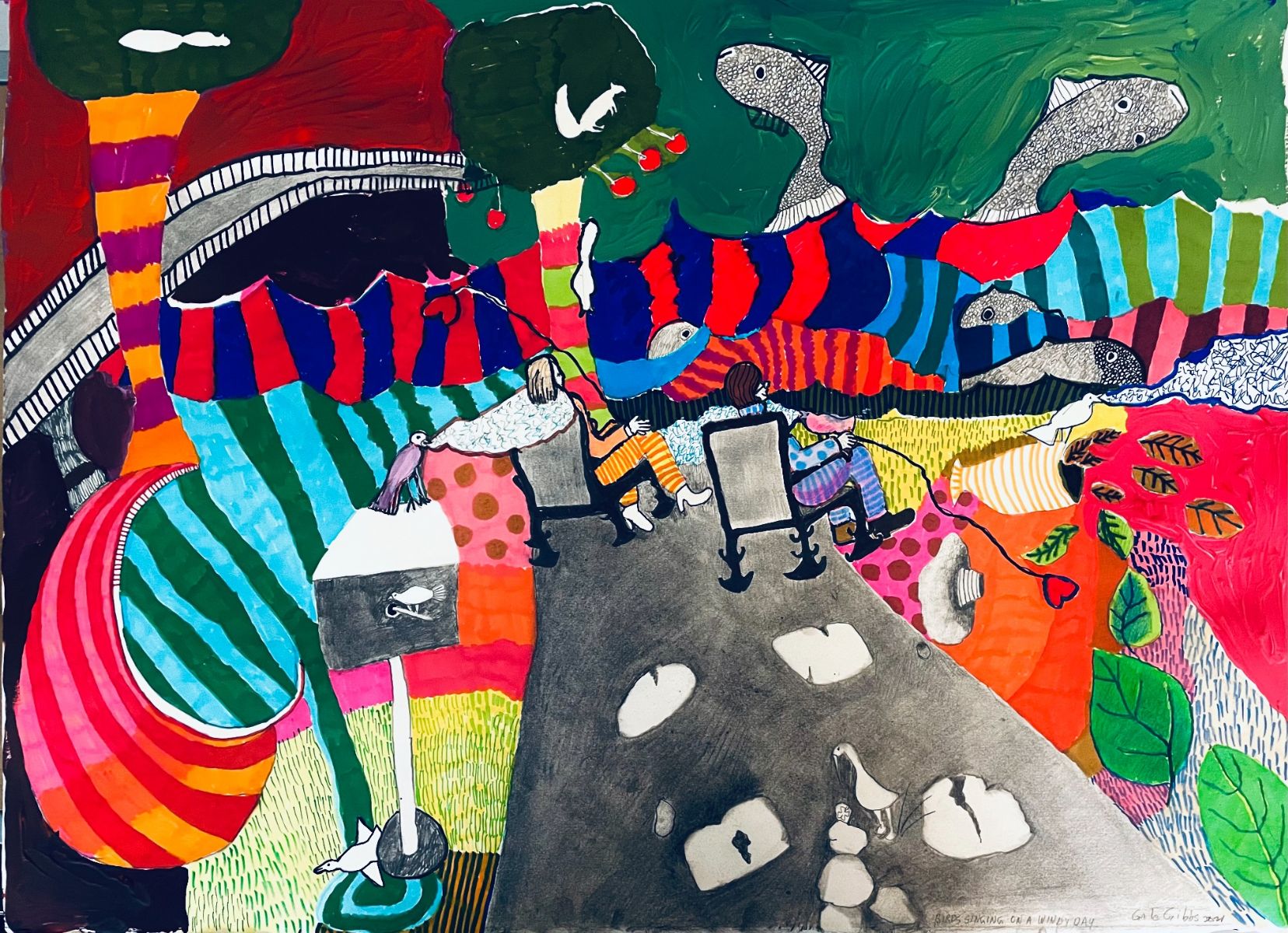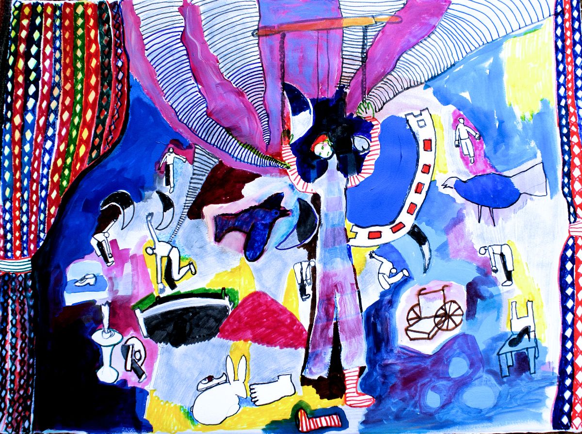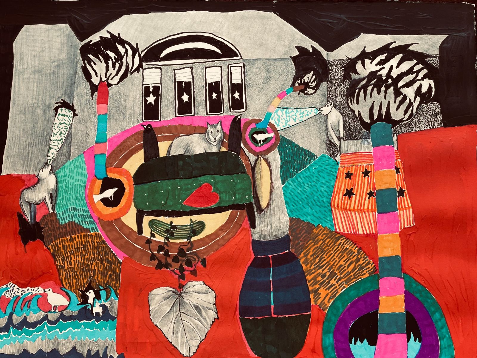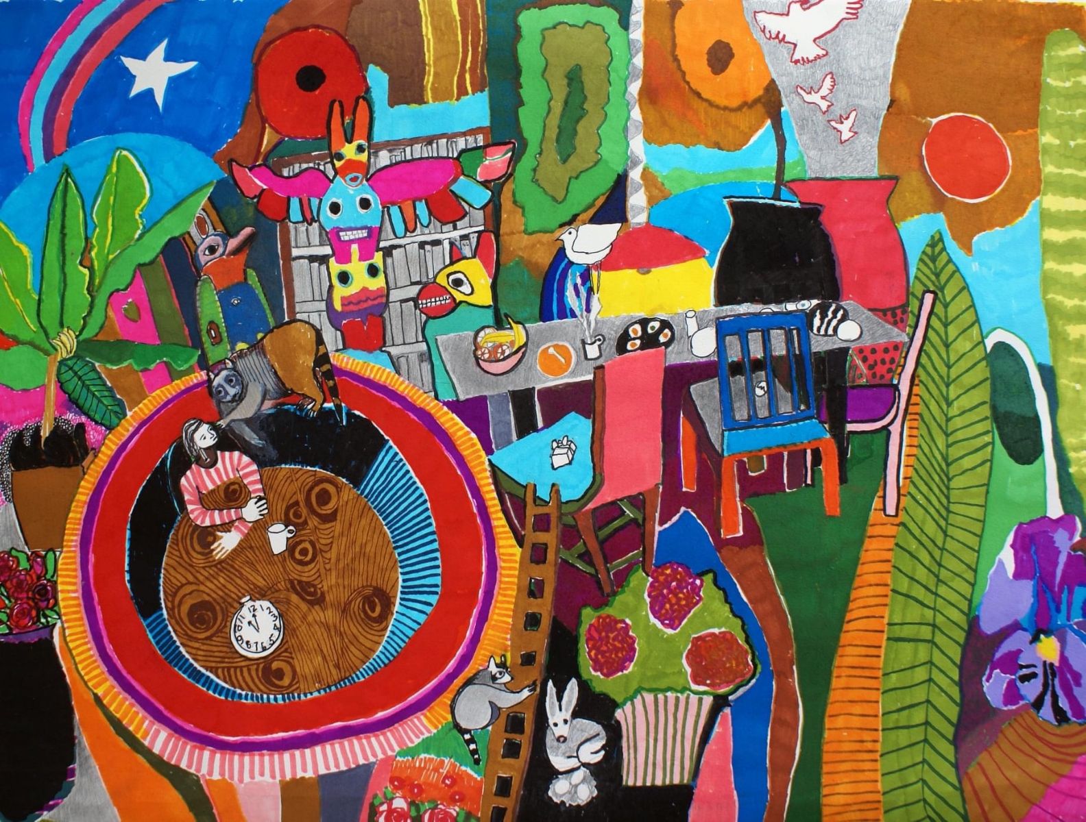 Acrylic, watercolor, pencil on rives paper, $1,000
