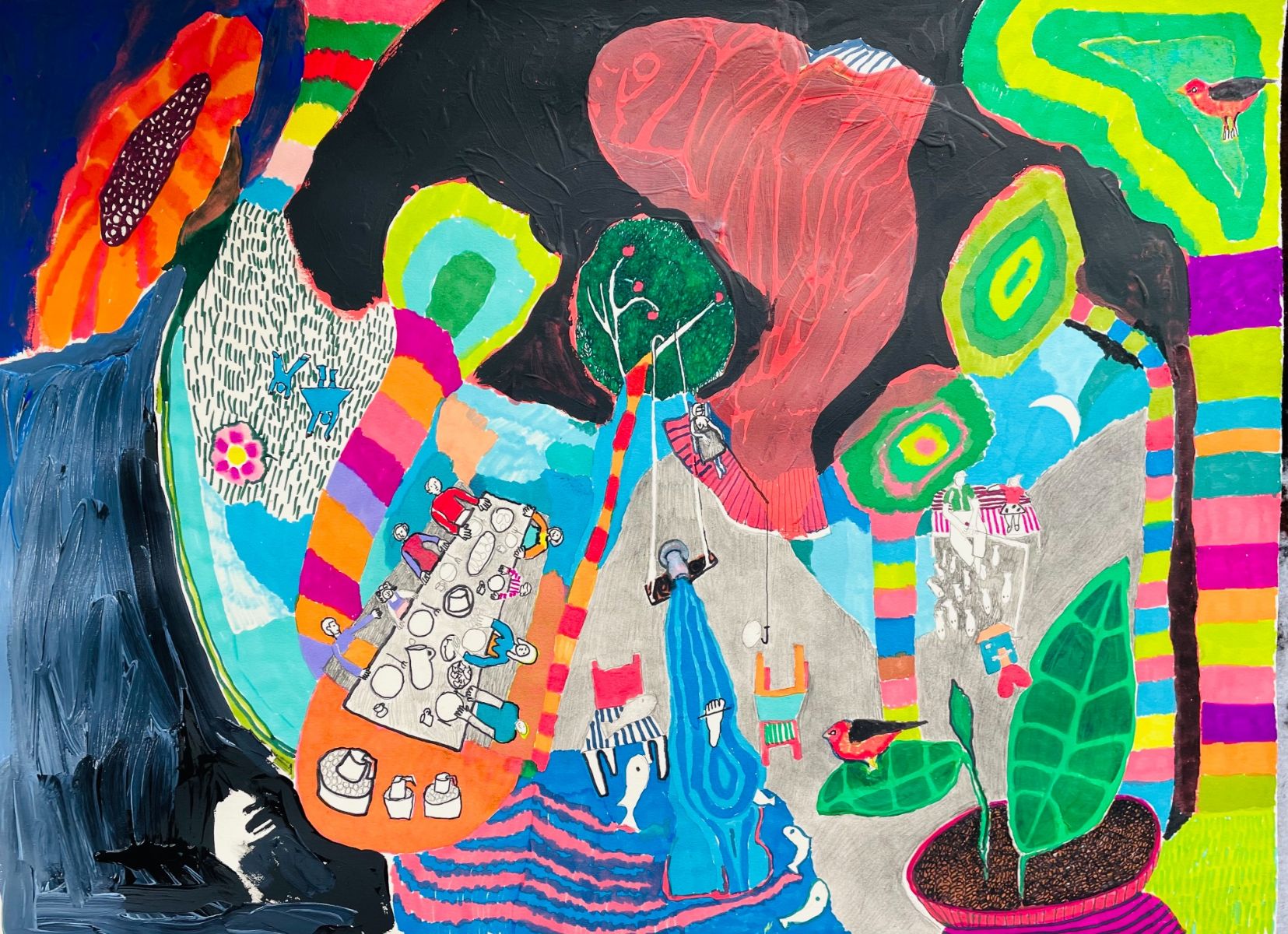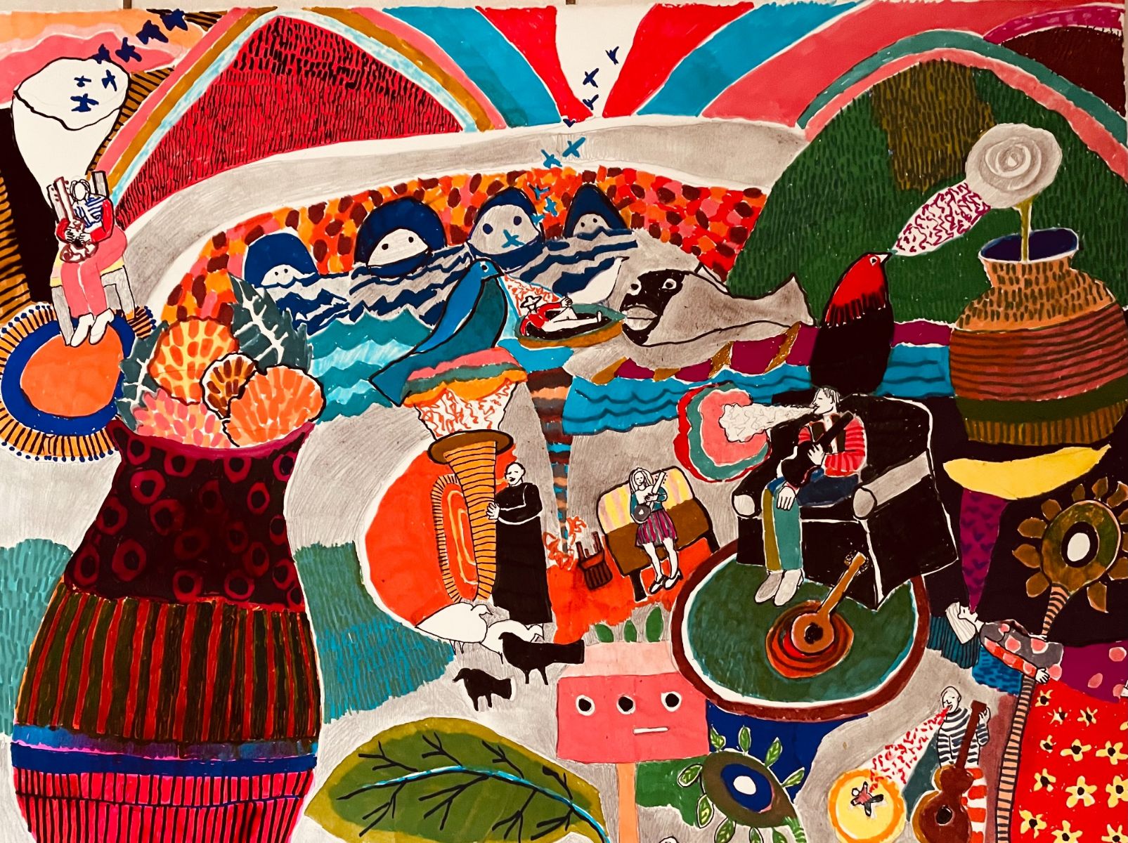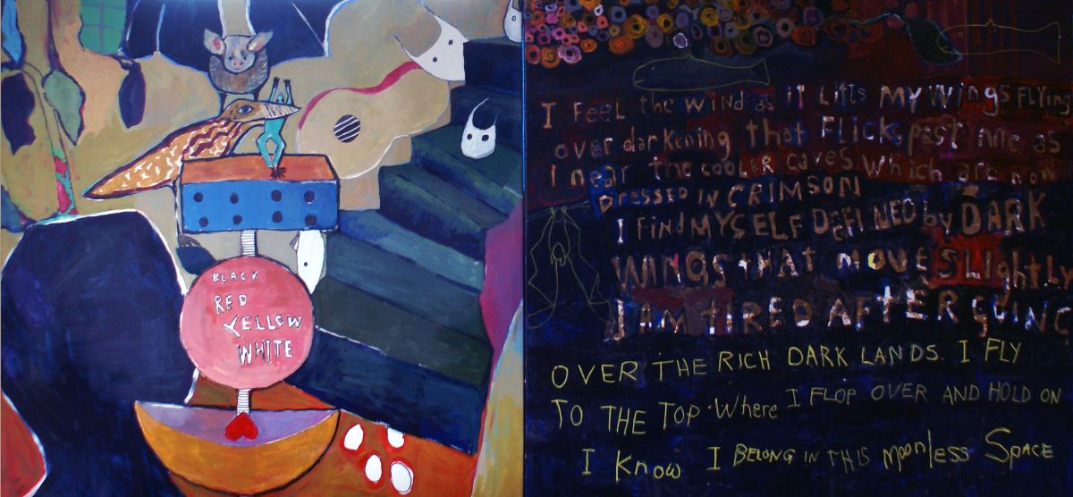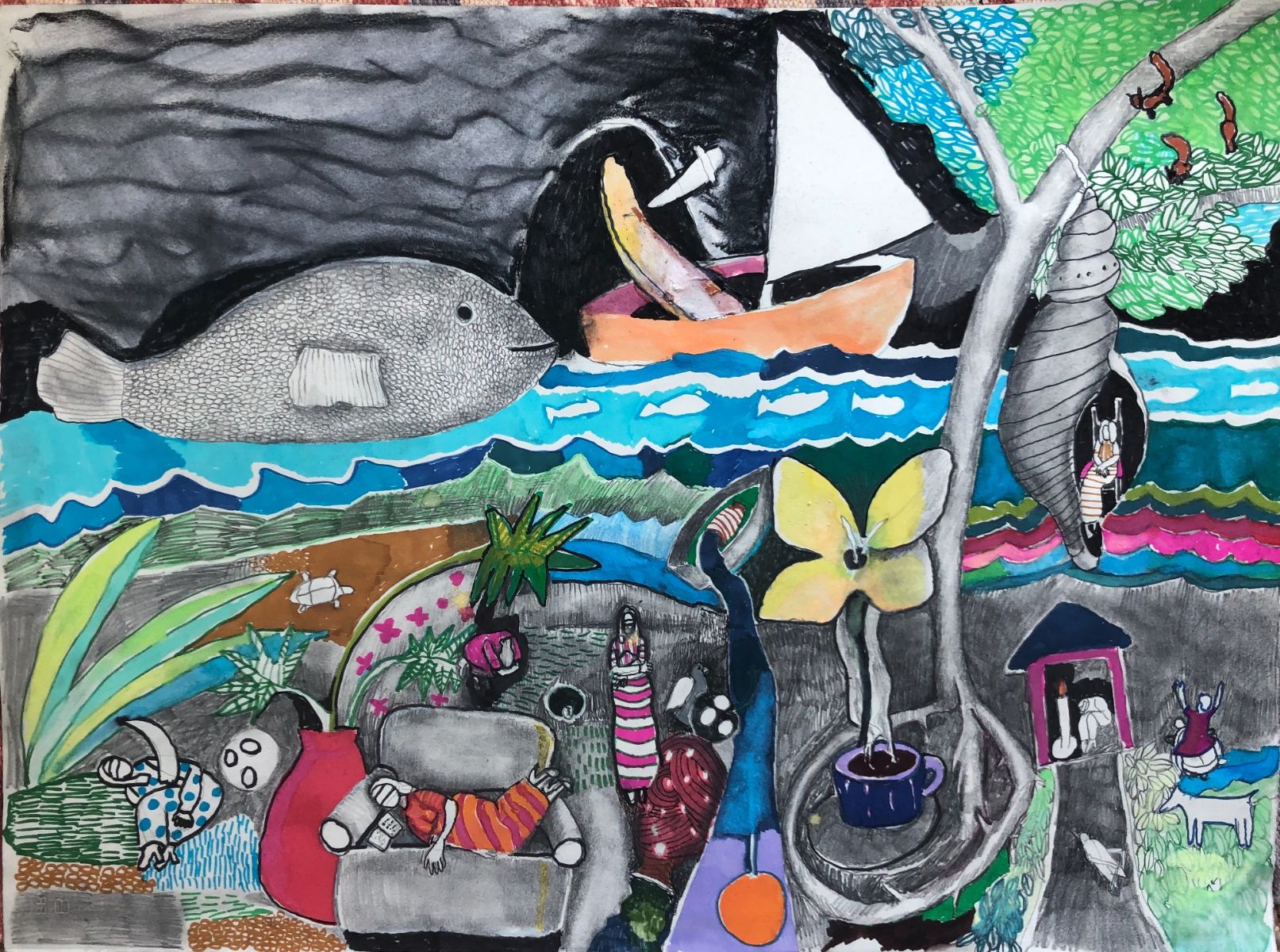 Acrylic, watercolor, pencil on rives paper, $1,000