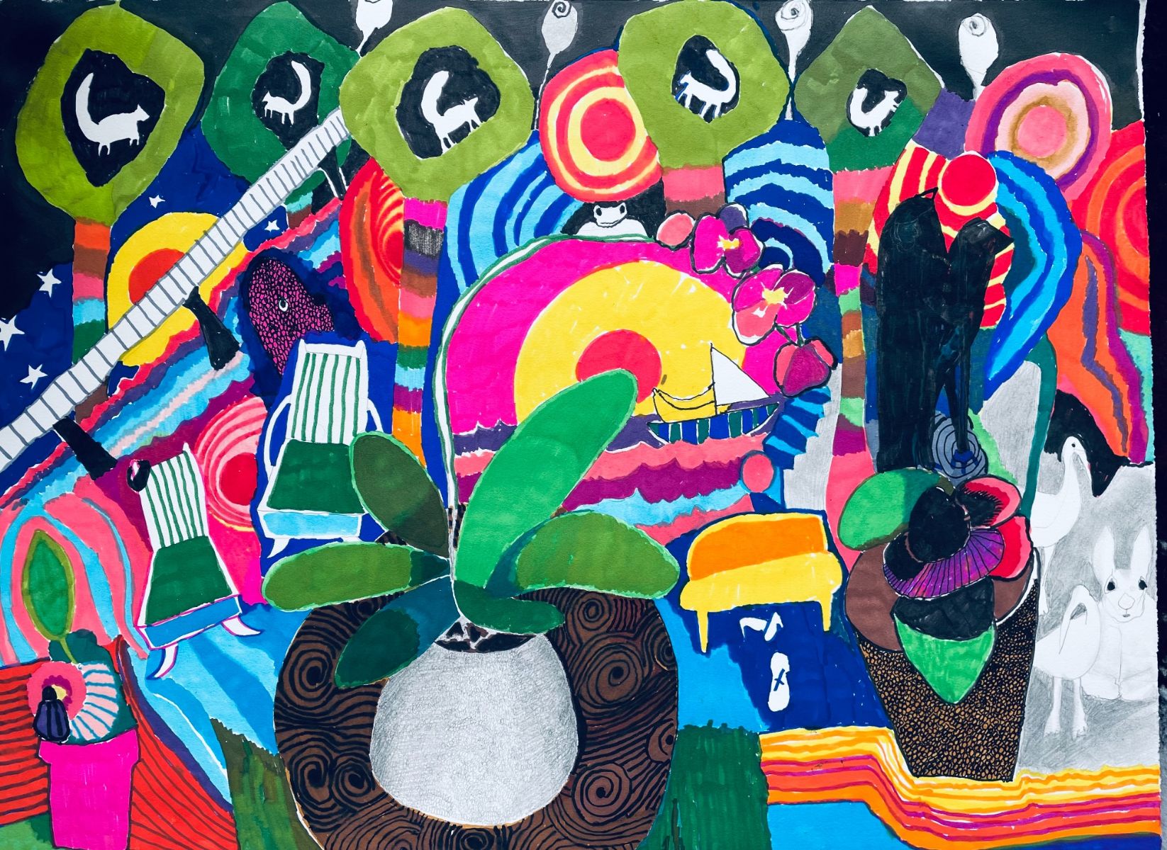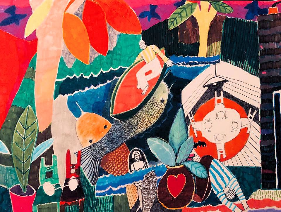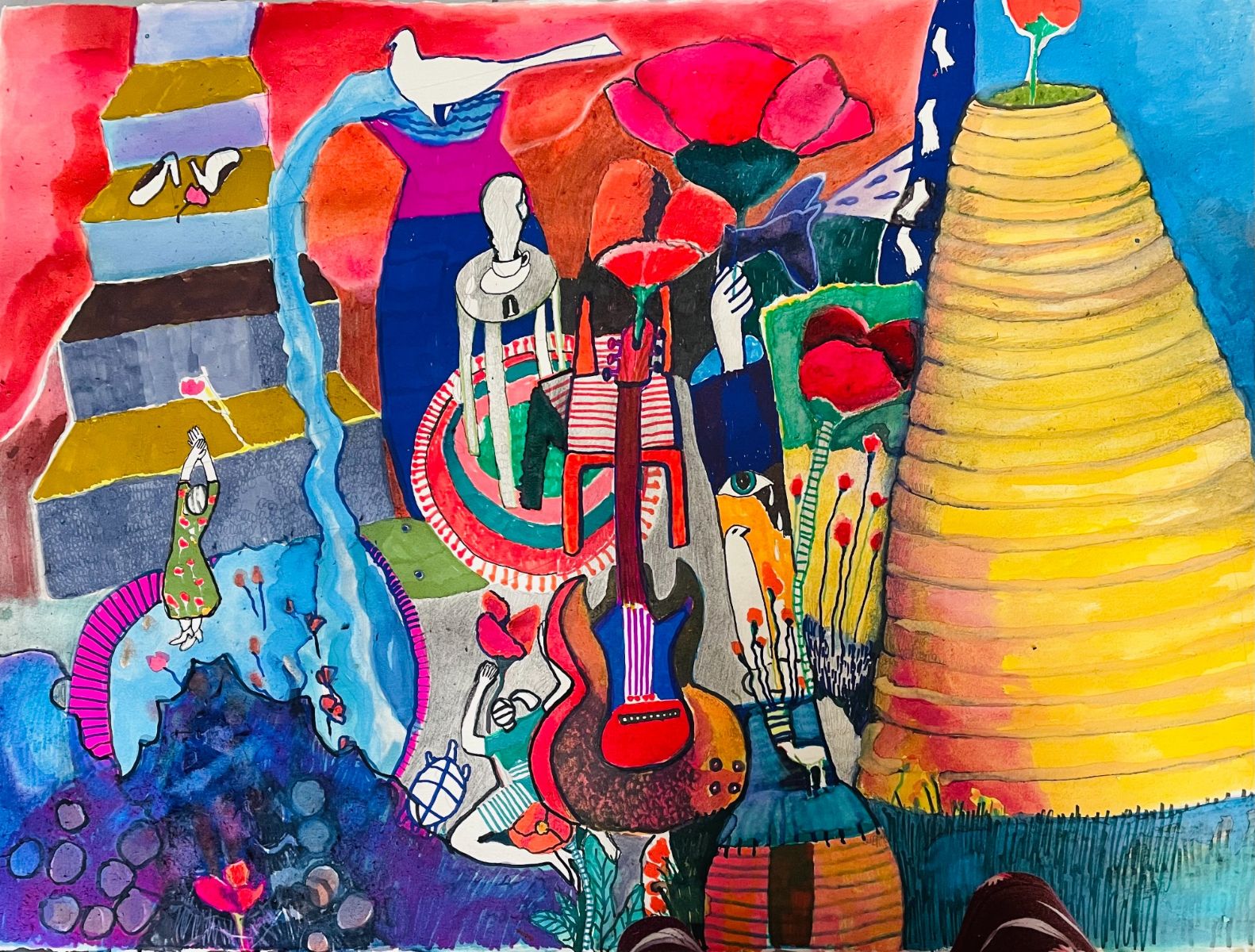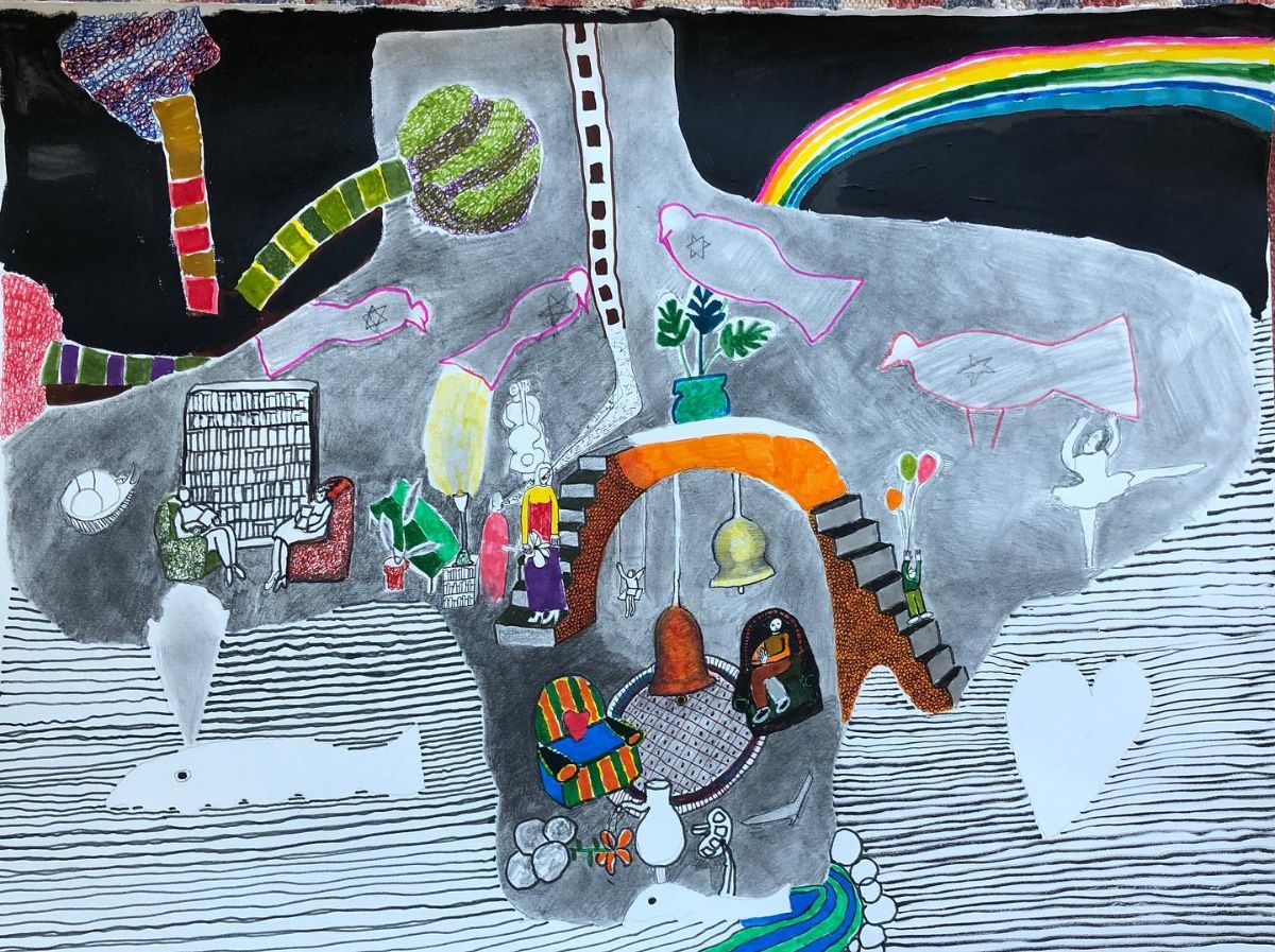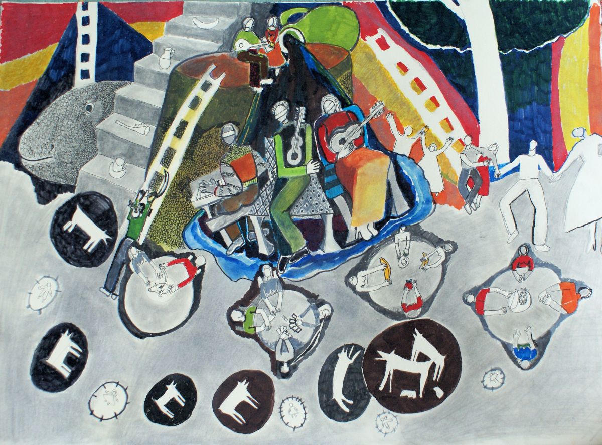 Acrylic, watercolor, pencil on rives paper, $1,000