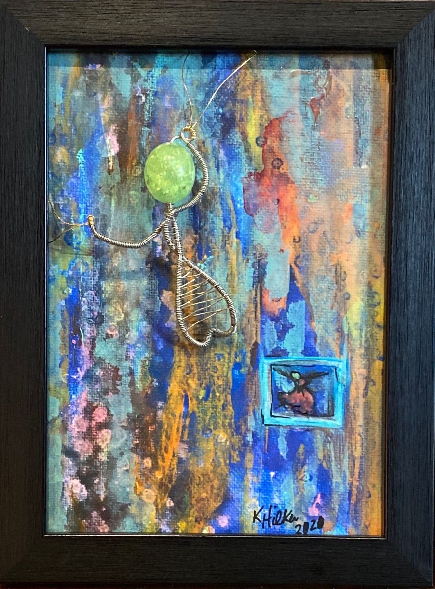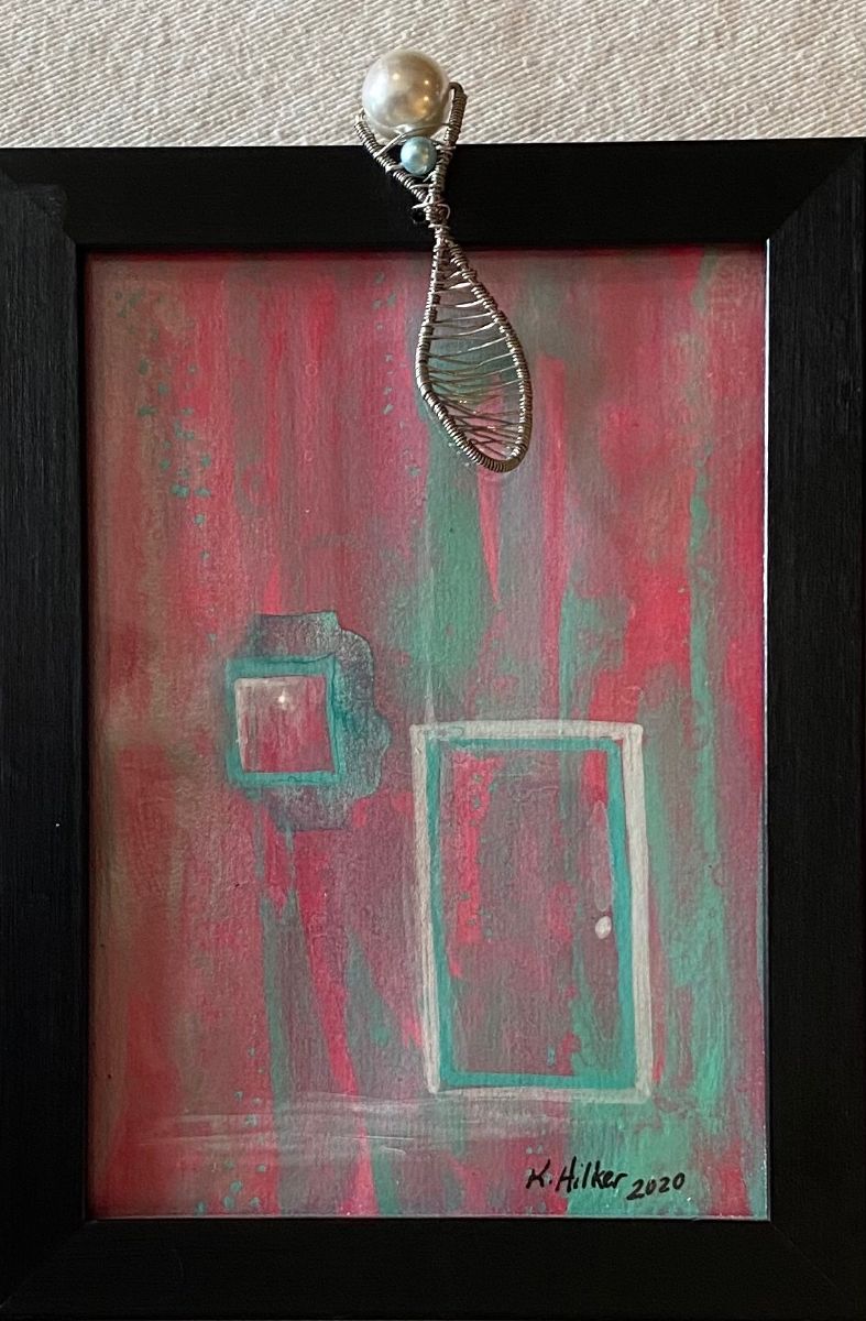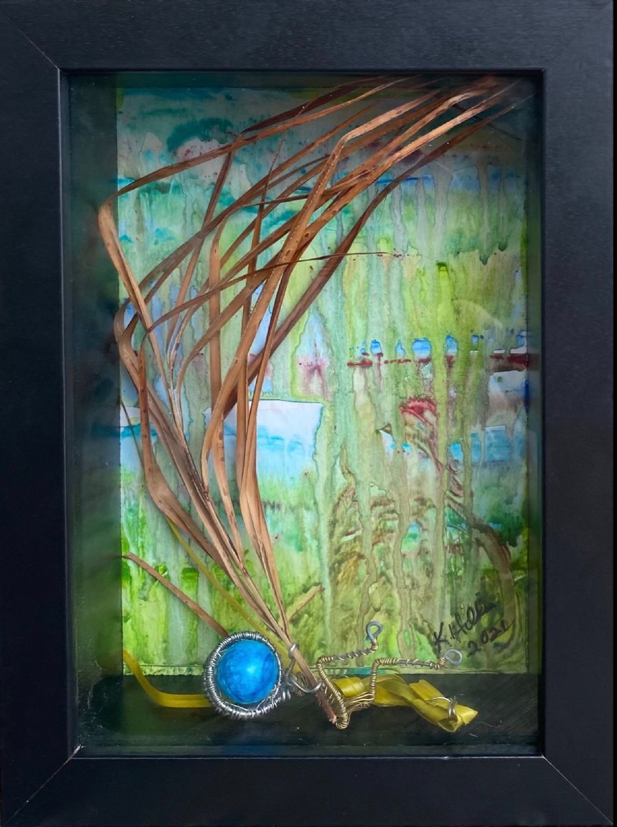 Framed,paper, acrylic, beads, silver wire,grass, $95