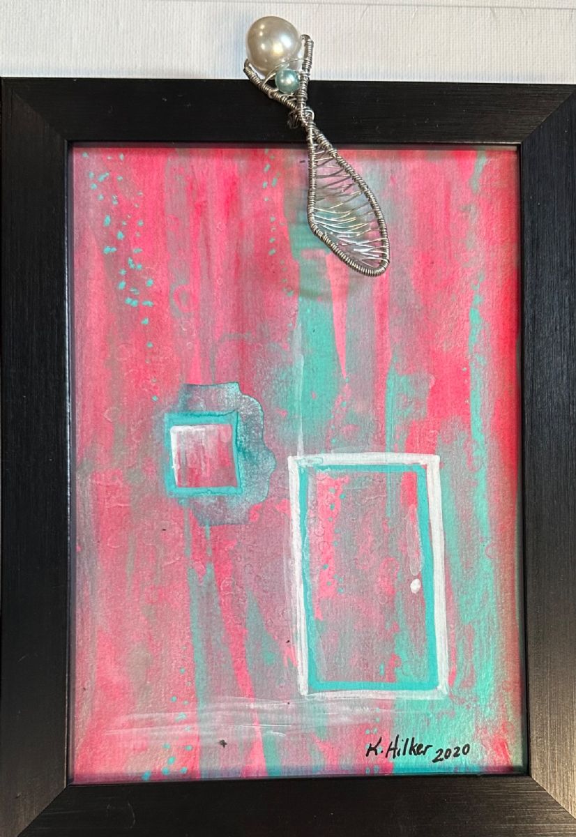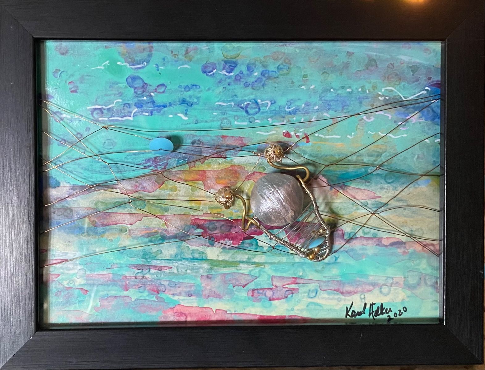 Framed,paper, acrylic, beads, silver wire,thread, $200