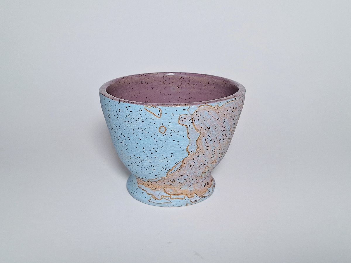 This decorative cup was surfaced with pigmented slip initially and then adorned with an underglaze-soaked cheese cloth that was left to dry on the vessel. Once removed, the pattern left behind was accentuated with sgraffito carving techniques and then inlayed with underglaze. The bulk of the pattern resembles a large, isolated landmass with a few small islands off its' coast. While the landmass wraps around part of the cup, there is a large body of water that separates both coasts, waiting to be explored.