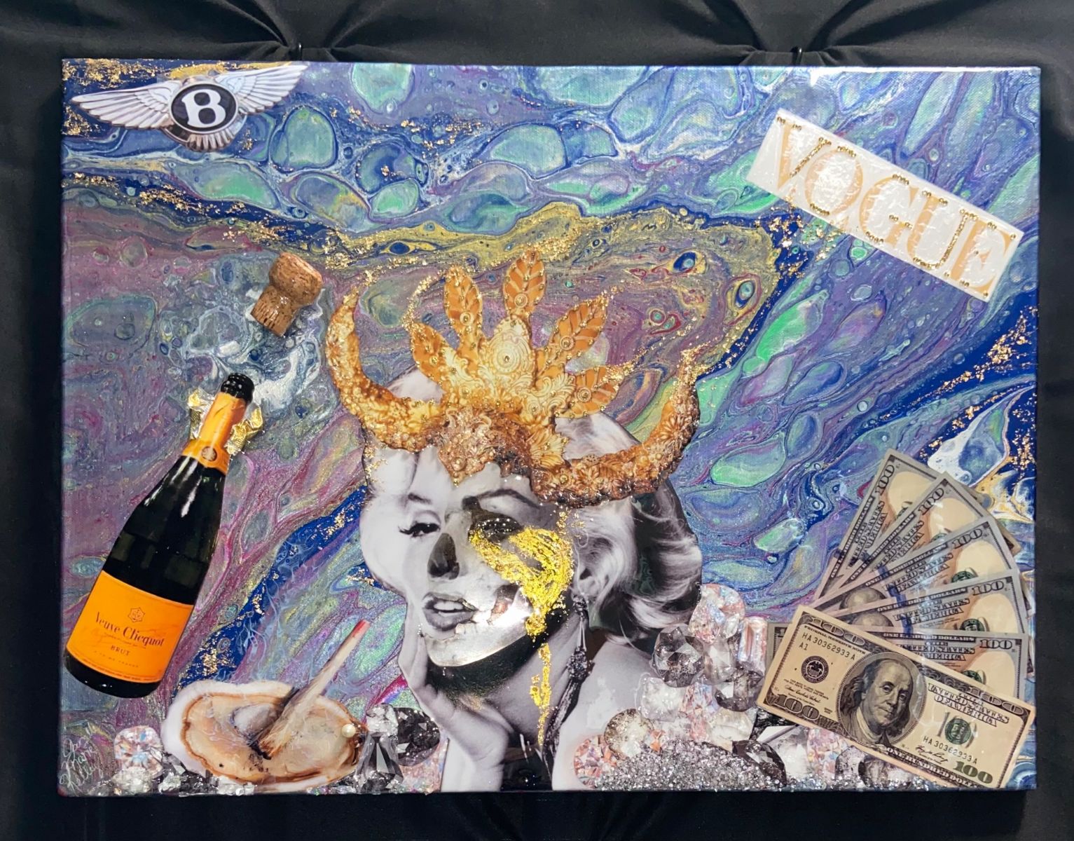 Acrylic, glass, cork, and resin on canvas with collage