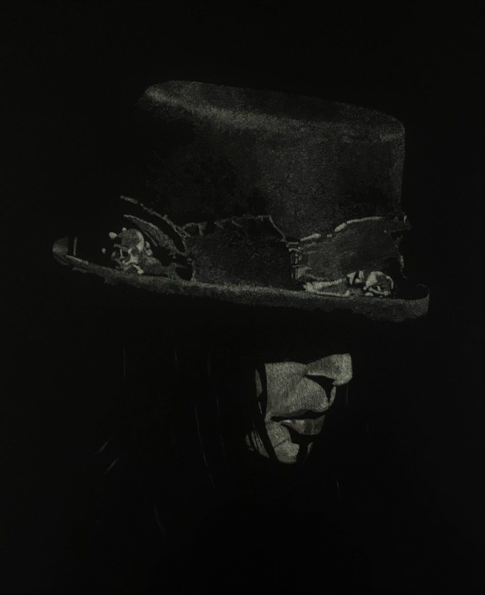 Mick Mars is the legendary guitarist for the heavy metal band Motley Crue. He recently retired from the band due to a lifelong illness. I love Mick Mars and really enjoyed doing this piece. His hat with skulls affixed to the band is typical "Mick-style." He often keeps his head slightly downward, which I believe is due to his Ankylosing Spondylitis condition. I'm so glad I got to see Mick play with Crue a few years ago on their stadium tour. Right now, this piece is hanging in my guitar room above a long rack of numerous guitars. I'd love to see this go into the home of a Motley Crue fan.