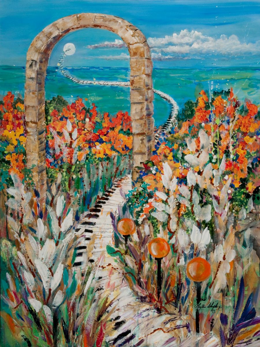 Our lives are a constant evolution of events molding us to reach our destiny. I have used the keyboard with its black and white keys to represent the events, good and bad, happy or sad that occur in our lives. As we learn from the events in our lives, we are transitioned into who we are to be. I have used the keys changing into birds going through the arch of life as a symbol of transition.
