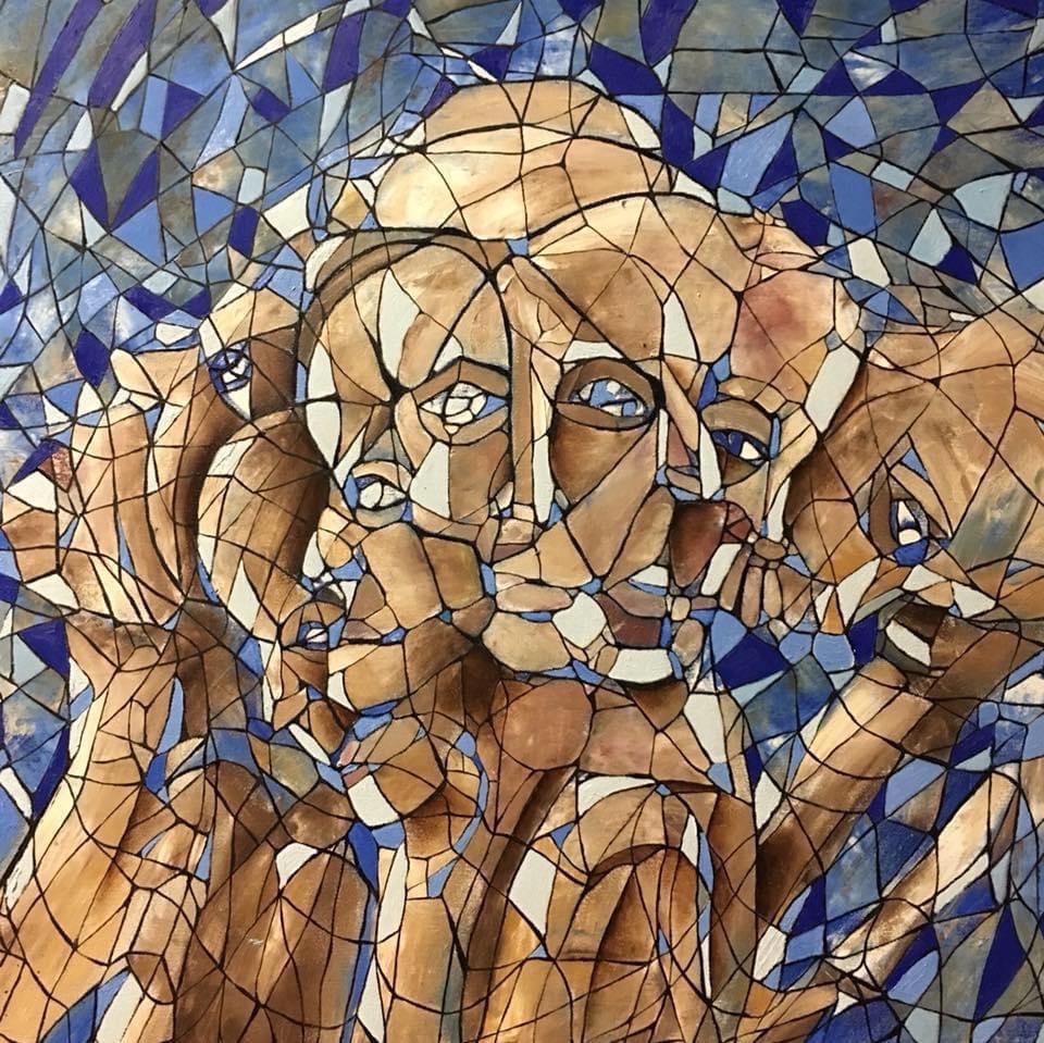 Breaking Space with Time. This painting was inspired by works of cubist artists and their ability to capture an object from multiple angles. This painting is a representation of time anxiety, chronophobia, and how an anxious person would look over time from different viewpoints. This painting is part of a series called Fractured Expressionism where the works take on a broken or shattered look. The texture of the painting is incorporated into the theme helping to provoke certain emotions. This painting was created with the use of brushes and palette knives.