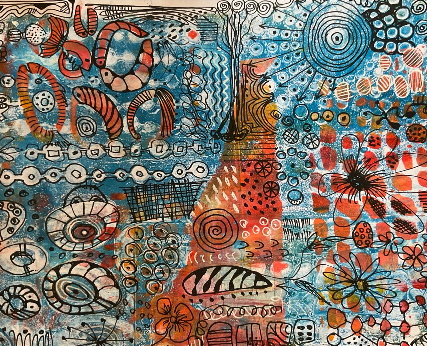 Acrylic paint, paper, pen and ink drawing on wood panel. An experiment with printing and then doodling on the printed paper.