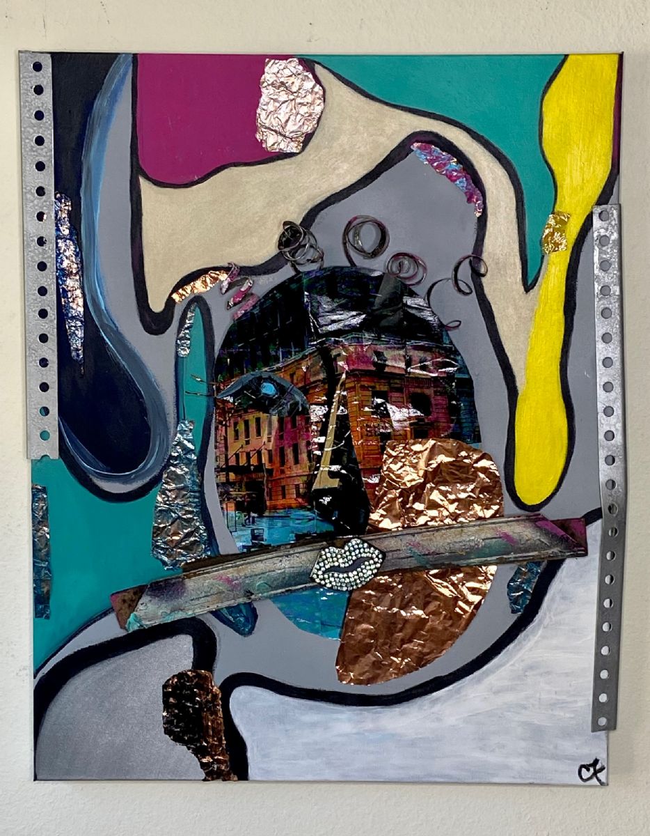 In pieces reflects how I've felt most of my life. Challenged by different health issues over the years and for the last 16 years I've been managing a chronic illness called CRPS. Acrylic paints, recycled materials.