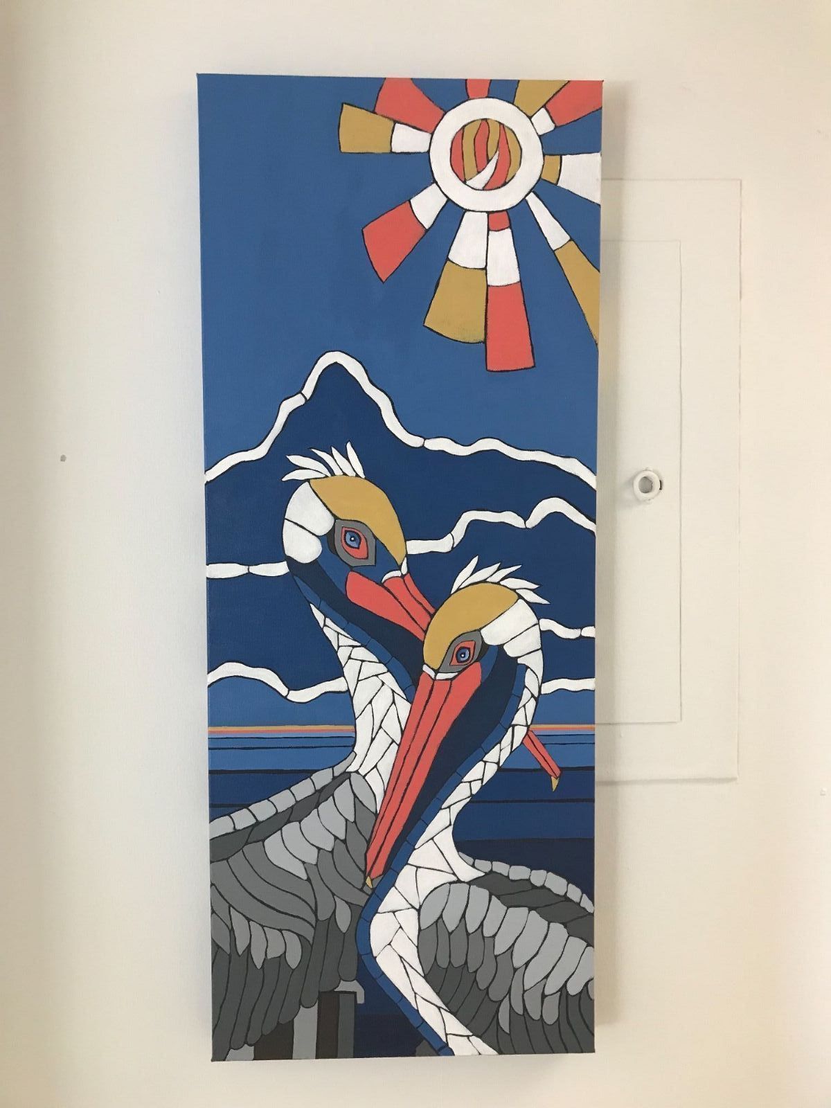 This painting is two pelicans enjoying our sunrise. Done in a colorful abstract.