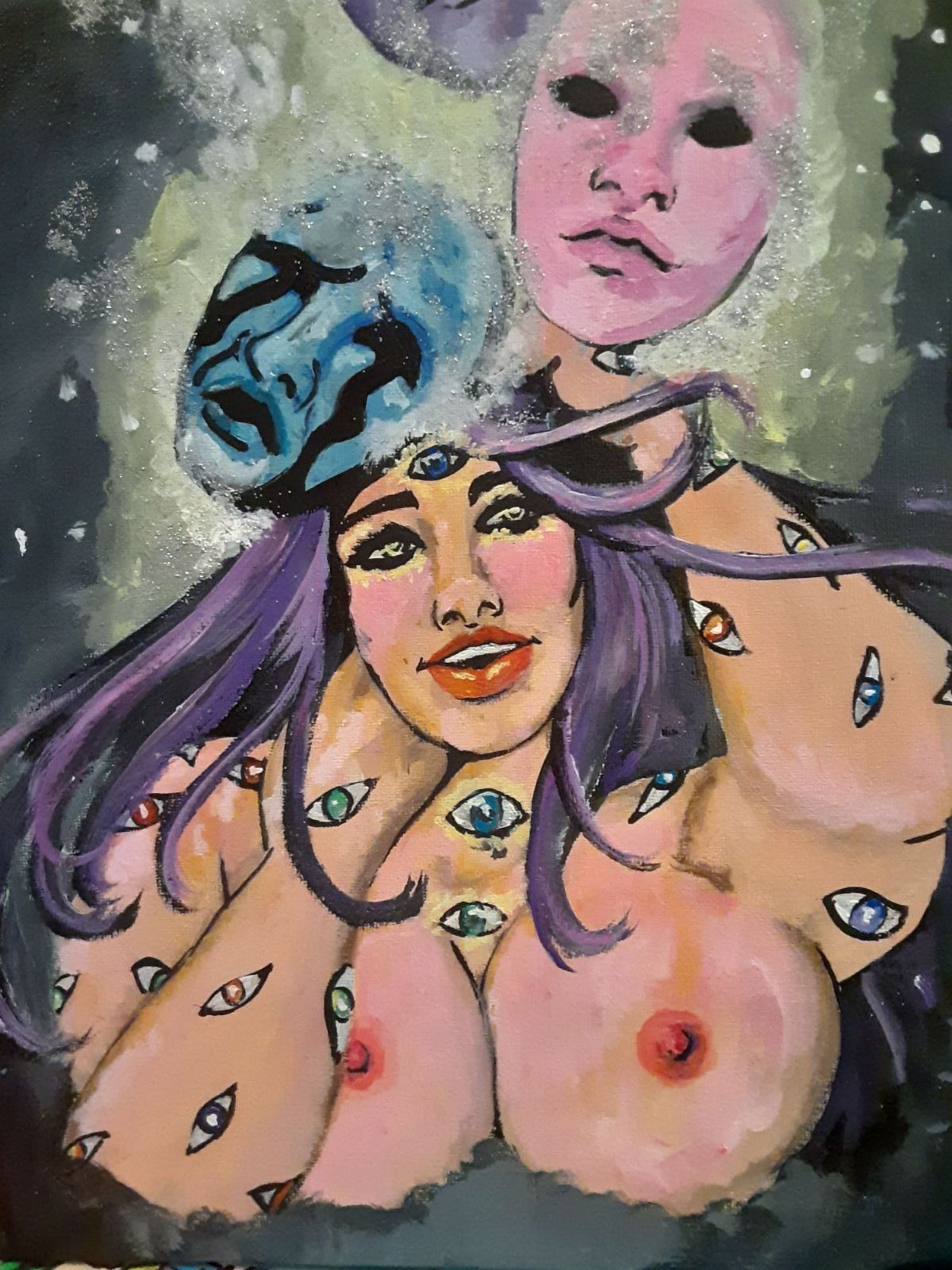 My work frequently features religious figures, angels and demons. This particular angel is in a state of transition, observing the viewer in anticipation. I purposefully left it ambiguous as to her direction, since the movements of Angels are frequently studied but rarely stated.