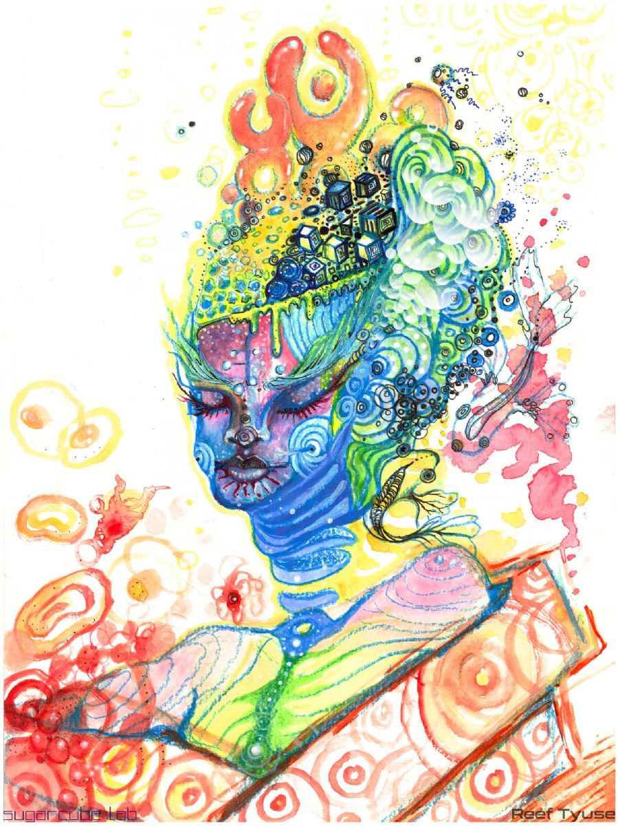 Yoko is as Japanese girl's name that translates into "ocean-child" or "child of sunlight." The woman in this piece is thus named Yoko (ocean-child) to represent positivity and new beginnings. The artist created this drawing with watercolors, ink and color pencil. She then added some final digital touches in photoshop to add tiny white highlights and bubbly details that adorn Yoko's crown.