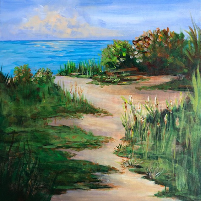 A sandy path leads to the sea in Florida. Acrylic, 20 x 20"