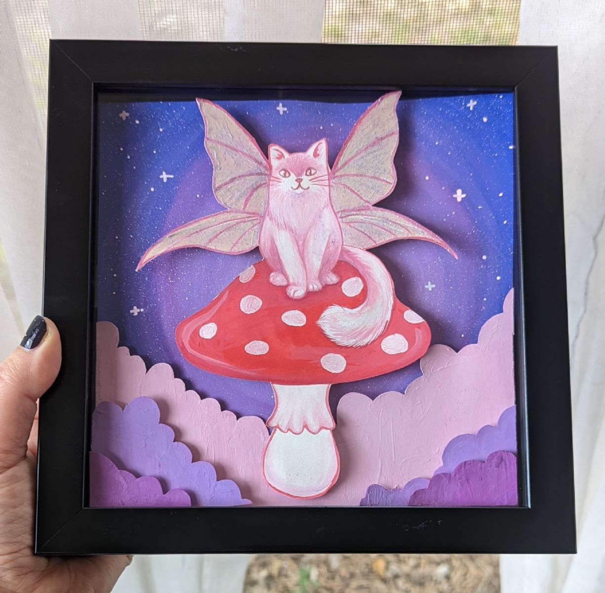 For this artowork, I painted multiple layers on paper with gouache, cut out each layer and glued them into a shadow box. The idea was to create a 3D affect so that the different layers appaeared to pop off one another.