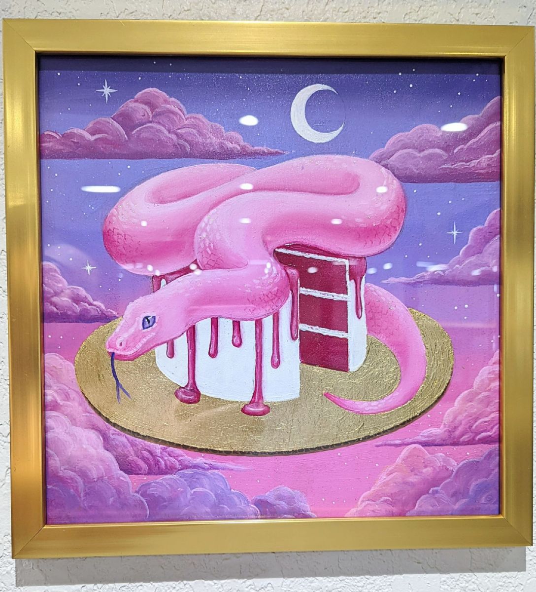 In this painting, "Toxic", I attempted to let go of my mind's desire to be perfectly detailed, as detail was something I tended to push in my previous color pencil work. I let go of the desire to be "realistic", especially with the snake. Initially, the snake was to be green, as I wanted it to be real, but I soon remembered that as an artist, we are allowed to create our own realities in our work. The original intent behind this work was to express how I felt about the concept of gift giving for romantic partners.