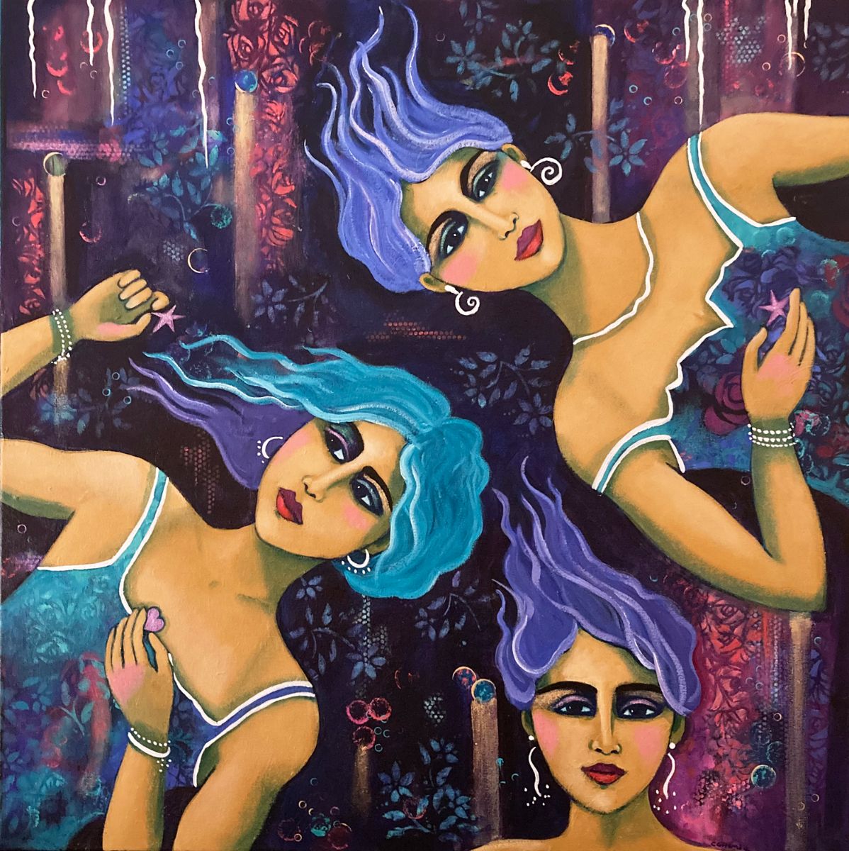 Three women float in a mysterious patterned space. They hold stars and hearts. They entice the viewer into their world. They flow