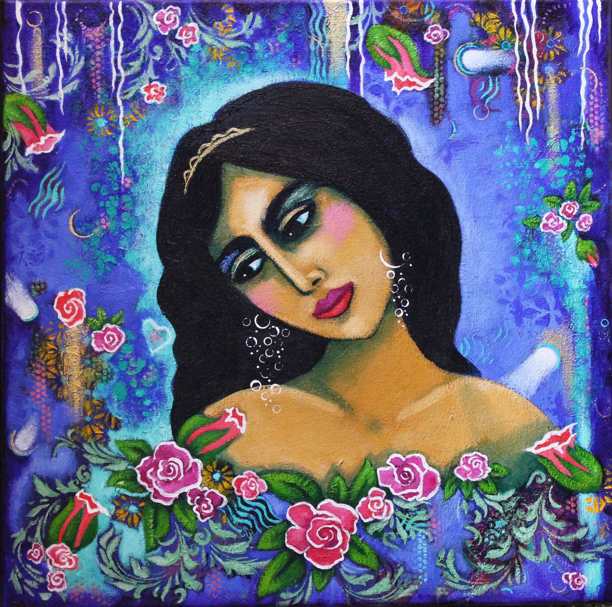 Acrylic on canvas 18" x 18"A woman, surrounded by flowers, gazes downward with a soulful expression