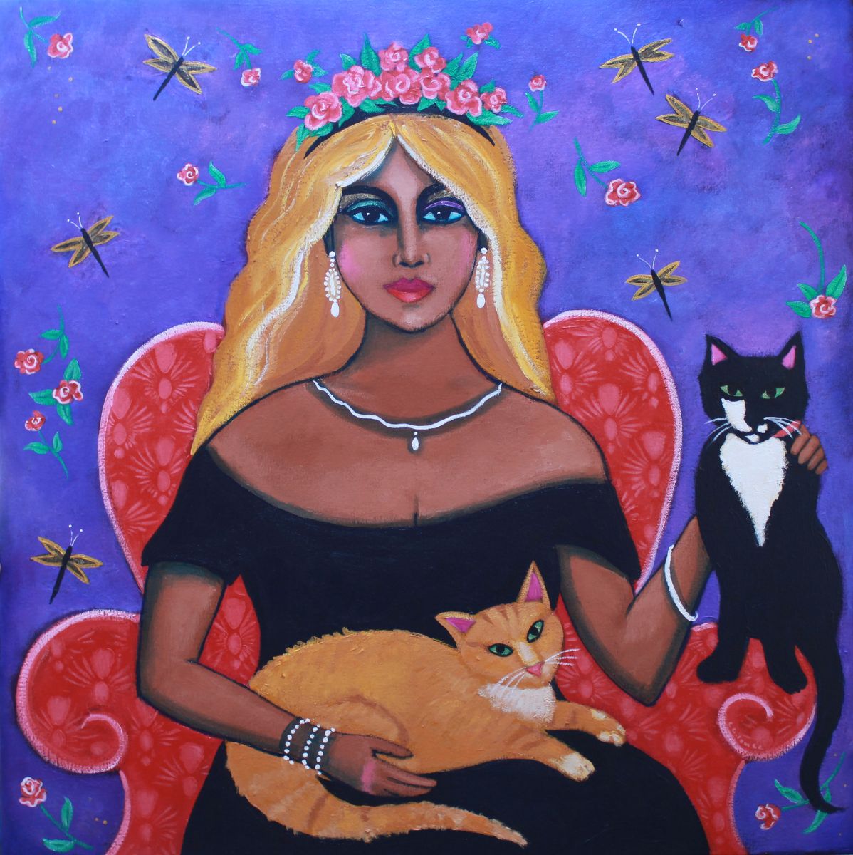 A woman, crowned with flowers sits on her chair/throne with her cats. She is strong. She will persist. Her cats are her royal attendants