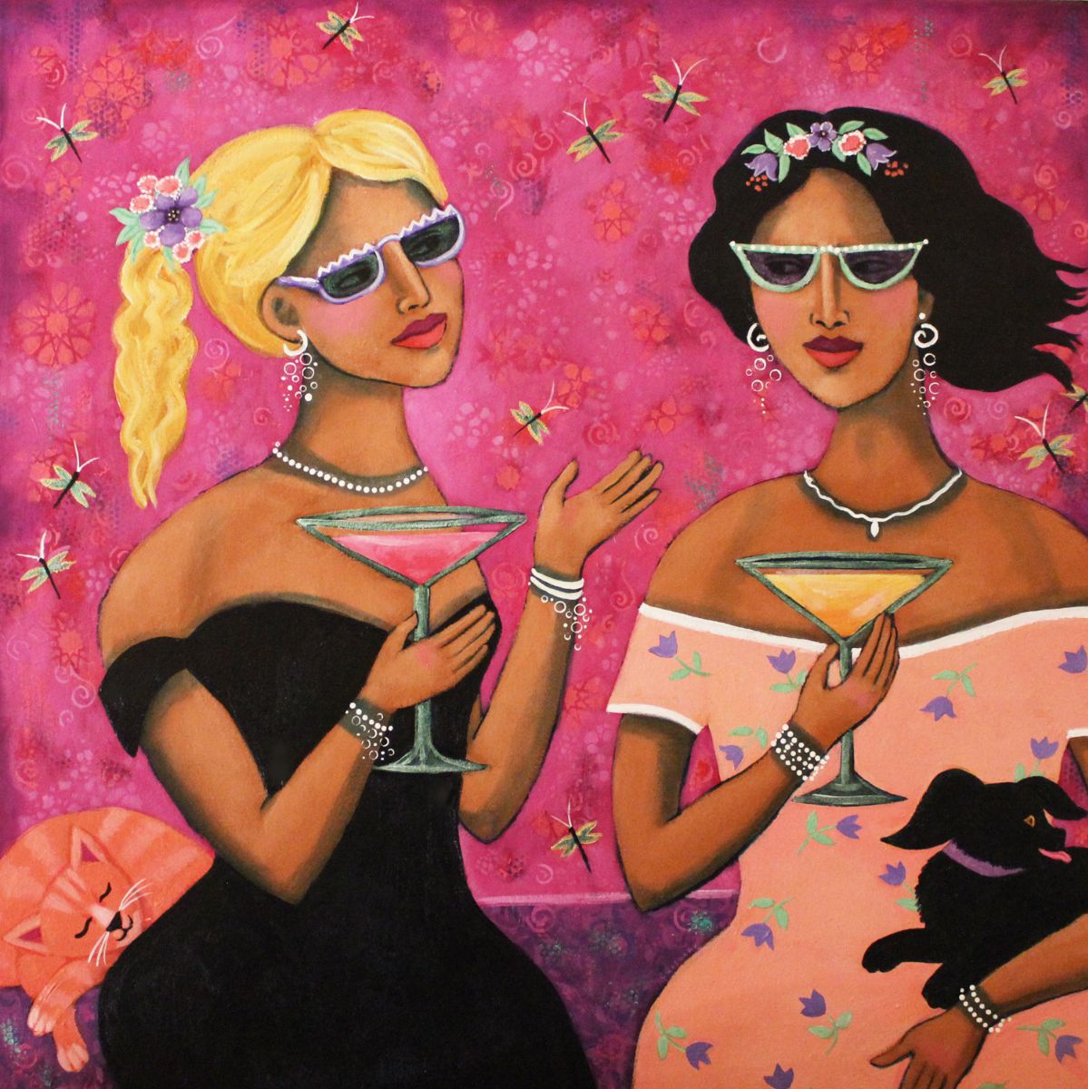 Two women and their pets celebrate their friendship, drinking martinis