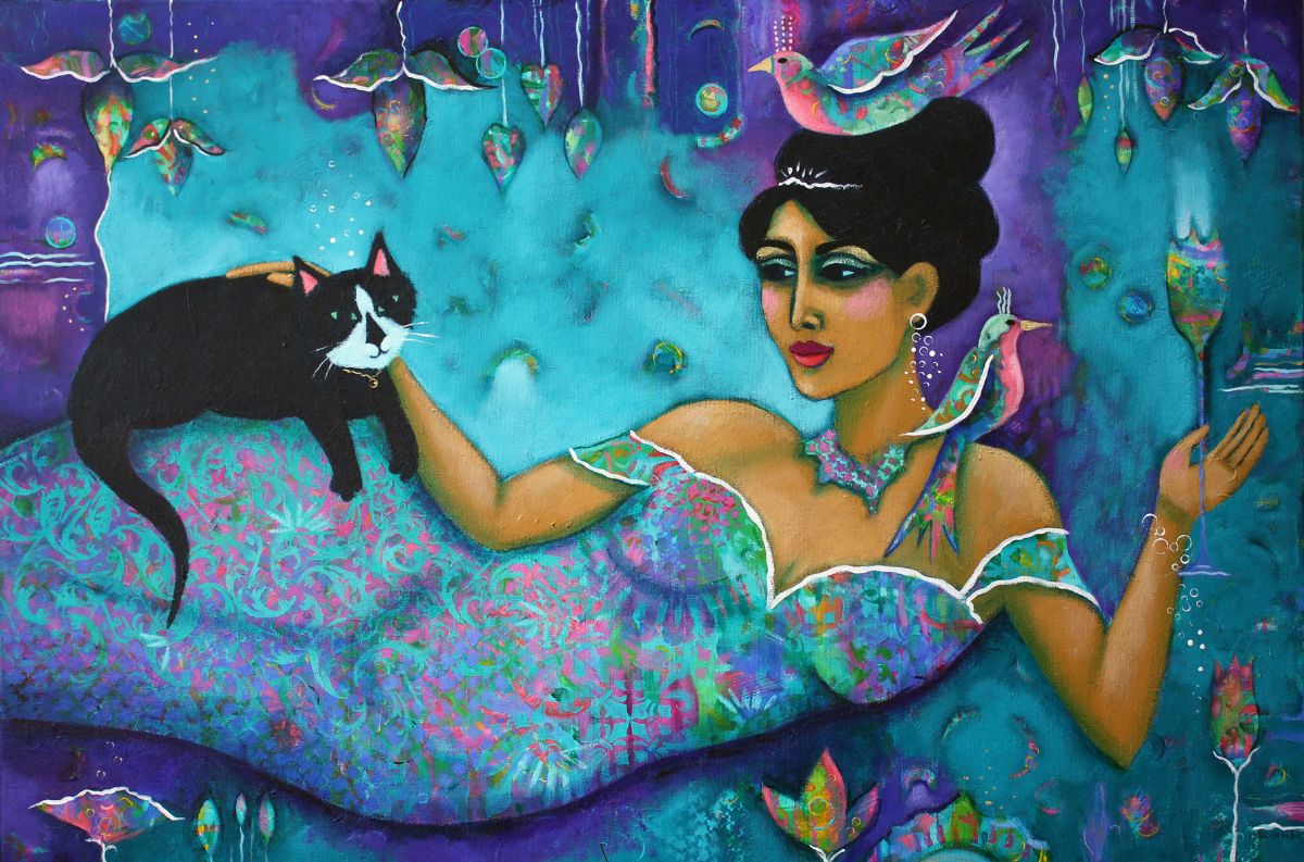 Acrylic on canvas 24" x 36" A woman floats through space with a cat on her hip and a bird on her head and shoulder. She is holding a champagne flute which is also a flower. Who is the princess? Who is the queen?