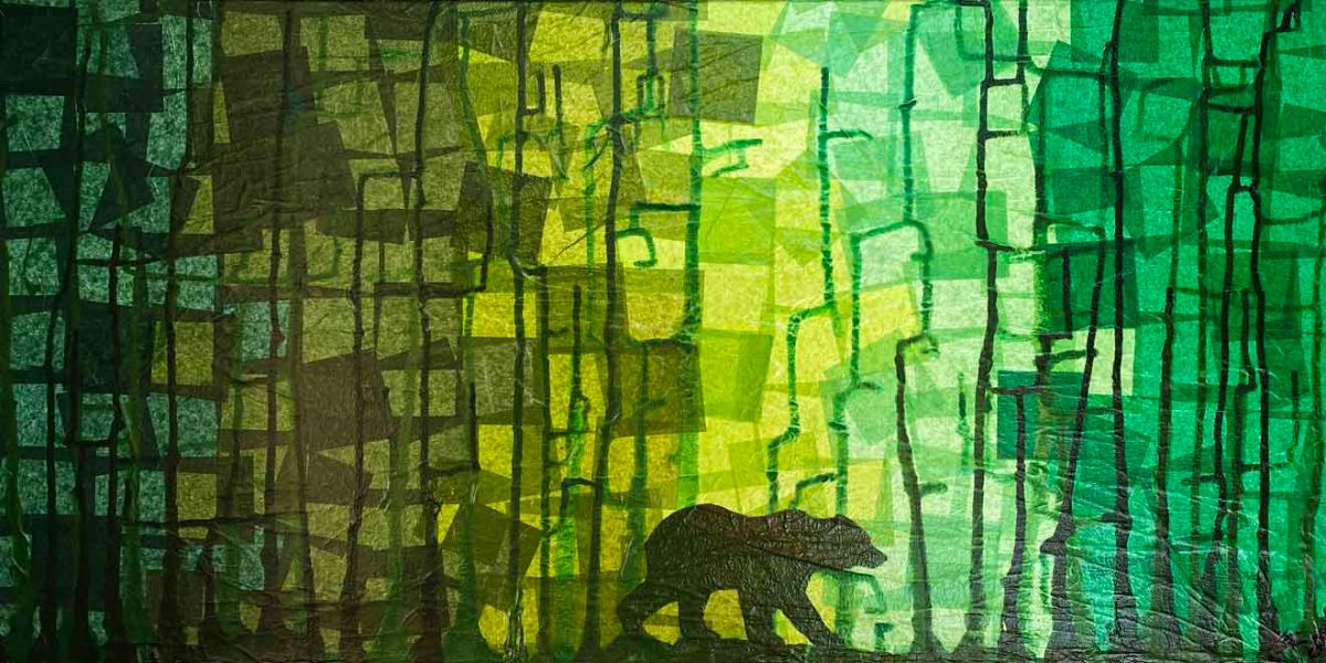 15x30 Paper and Acrylics on Canvas. Our bear coming to a bright clearing in the abstract forest.