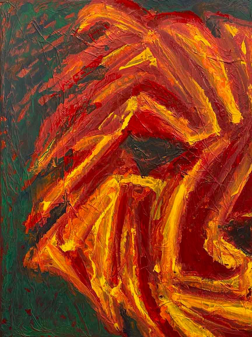Wet acrylics over a paper textured canvas. Strong strokes of orange, red, and yellow bleed together to create the gaze of the bear.