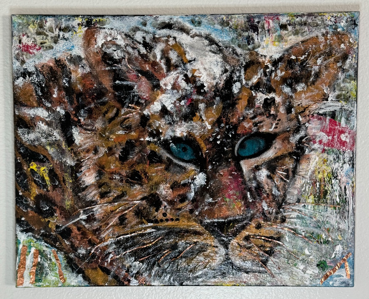 Animals have always played a huge part of my life. They're love is unconditional and they are natural mental "medicine". Big cats, for me, are symbols of strength and perseverance. In my journey, I've been challenged with a chronic illness, called, CRPS. I have had to fight and also persevere. Acrylic paints, with recycled copper and glass, finished with a high gloss.