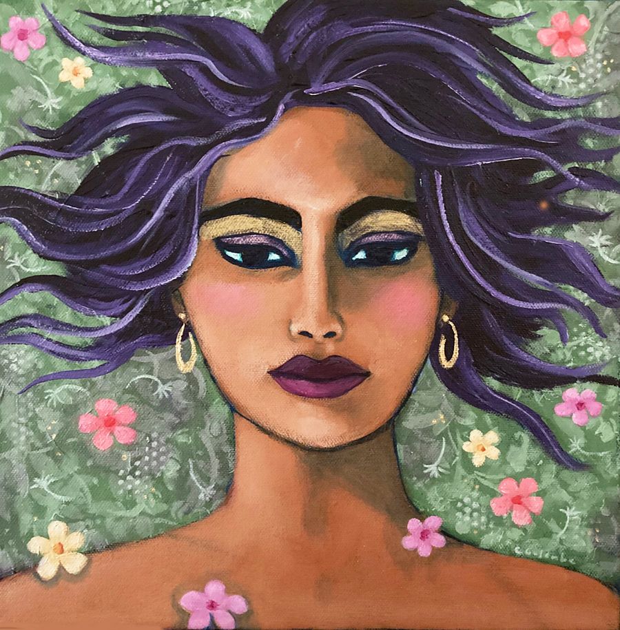 A woman with wild purple hair gazes down and out at the viewer. She is surrounded by falling flowers and is fiercely independent