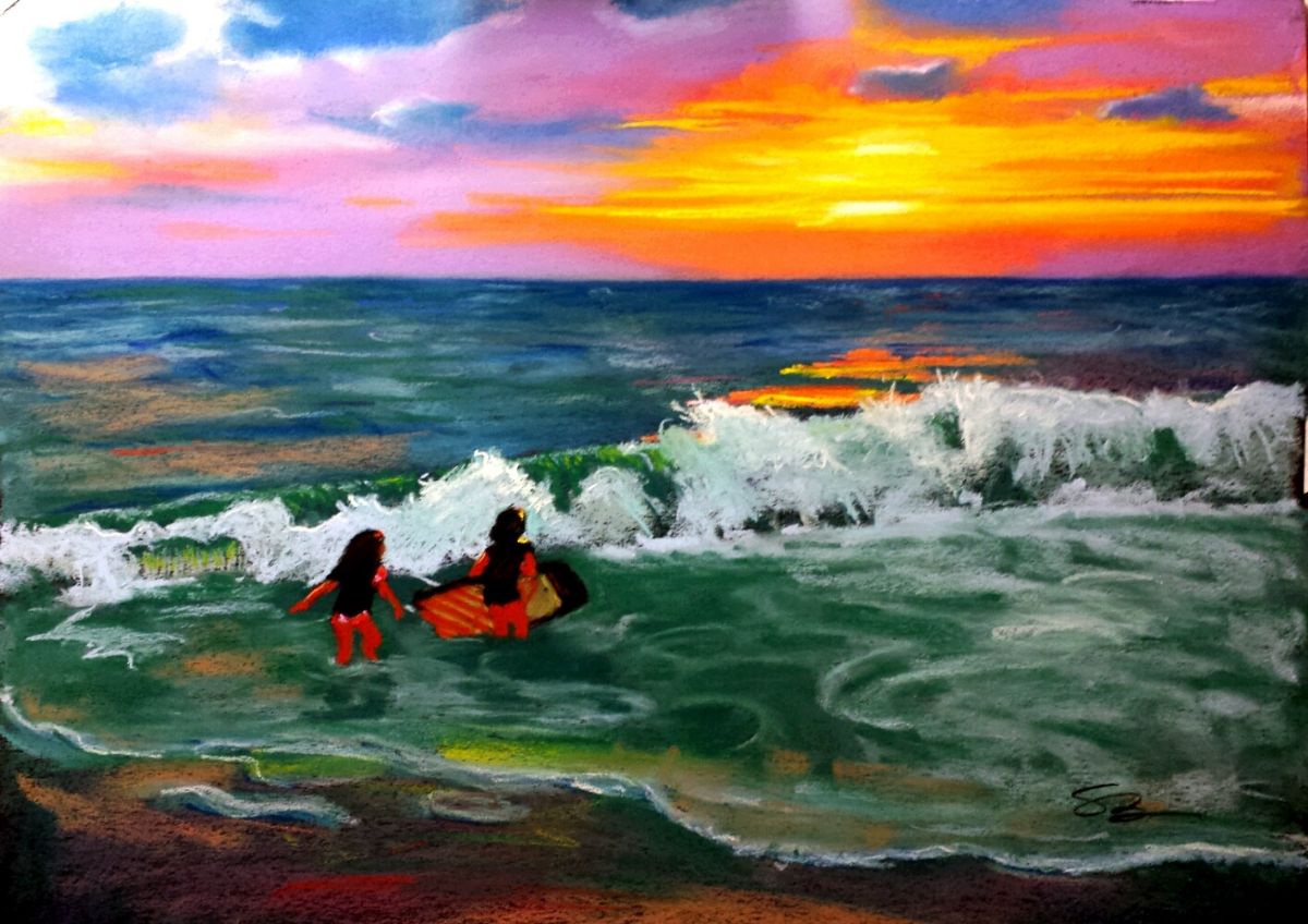 Surreal Seagate Sunset Swim | Pastel Painting, 28" x 18" x 1"