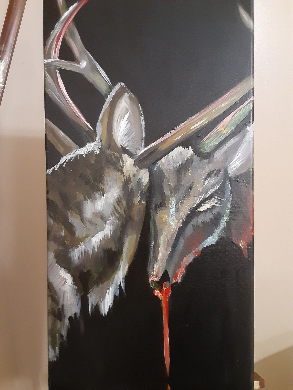 I depicted a buck who has achieved a Phyrric victory over his opponent. The other buck is dead, but with their antlers intertwined, the Victor is forced to stare his opponent in the eyes and face the consequences of his actions. What aspects of the self are killed in a similarly brutal fashion in order to live in our own society? Is the face in the mirror a long dead foe, or a fresh kill?