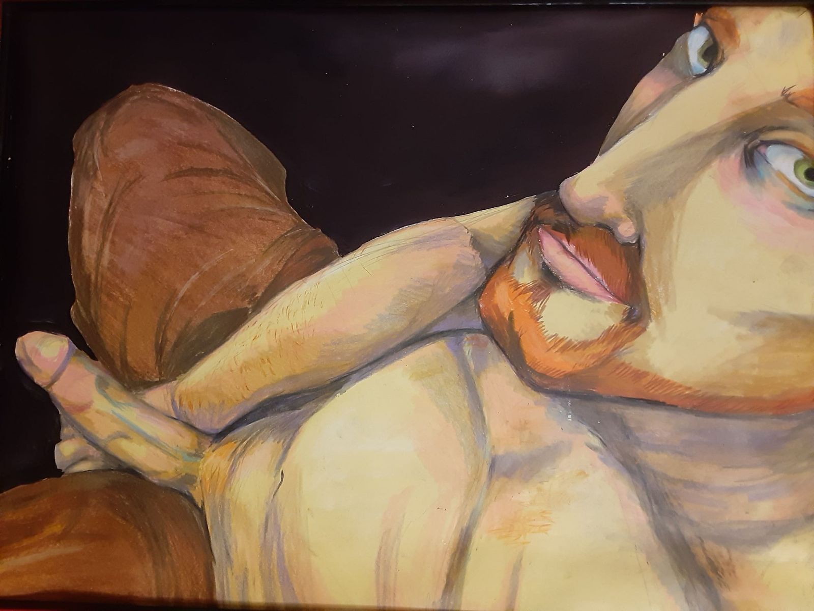 My erotic drawing of Vincent van Gogh depicts him in the remains of the same outfit from Paul Gauguin's "The Painter of Sunflowers" (1888). This, more than some of my other works, has to do with how perceptions are distorted. In order to achieve the extreme perspective, my model and I had our faces almost pressed together when I was working on this piece. It's a very intimate and distorted perspective, which given the subject is a historical figure whose legacy is a mix of pedestalization and kitsch (I got the idea for this piece when I was working in the gift shop for an immersive van Gogh experience) I feel is appropriate.