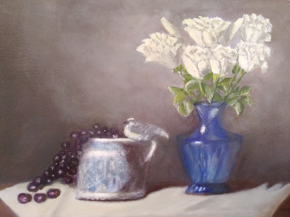 A STILL LIFE REMINISCENCE OF THE DUTCH MASTERS WITH ROSES AND A BIRD PERCHED ON A CERAMIC SUGAR BOUL FILLED GRAPES . WITH THE LIGHT FLOWING FROM THE LEFT, THE MUTED IMAGES IN THE SUGAR BOAL AND THE REFLECTIONS IN THE GLASS VASE ARE SOFTENED BY THE WISPY BACKGROUND.