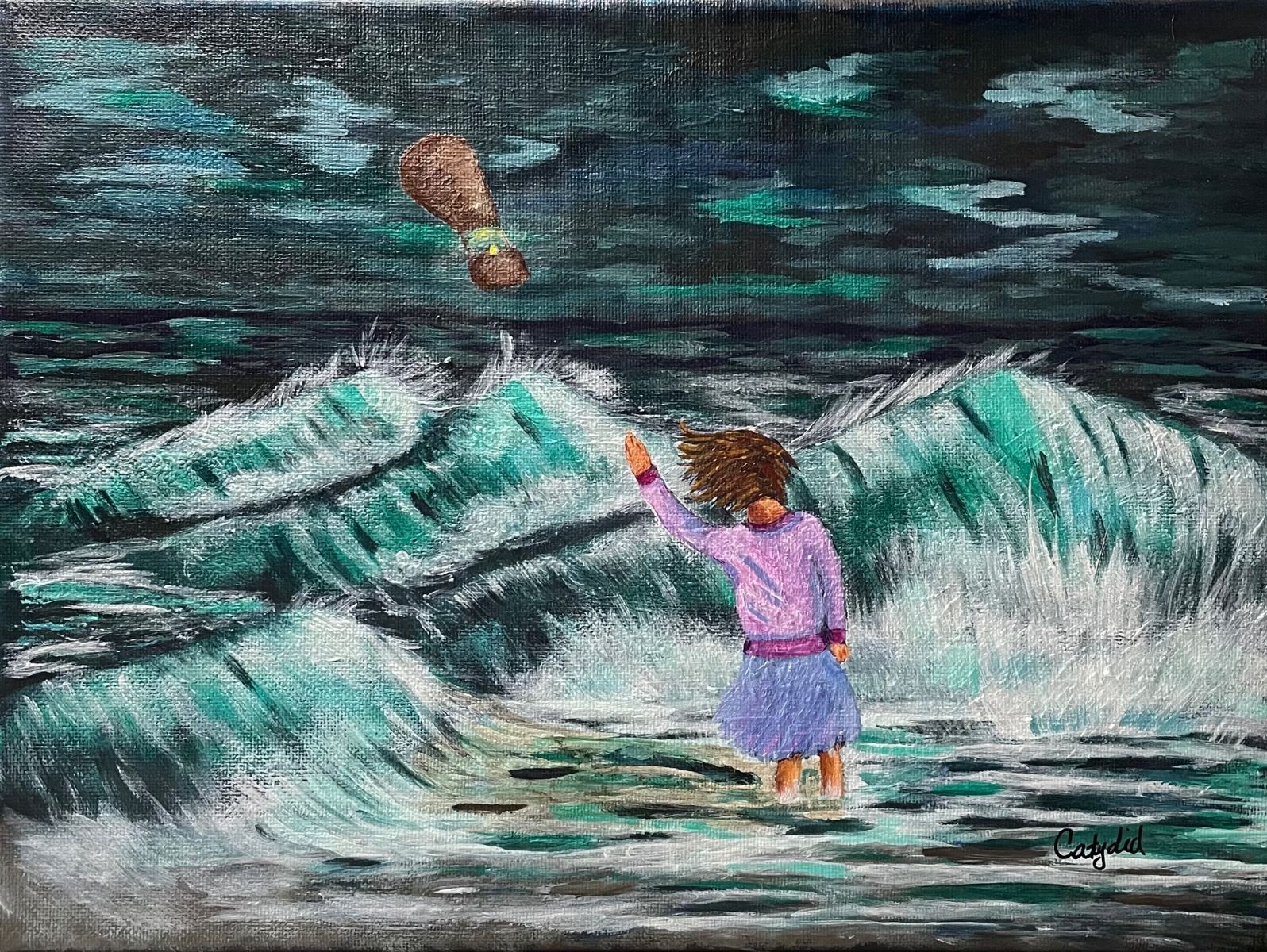 This is an acrylic painting that was painted on a 9" x 12" stretched canvas. This painting was painted for submission to the juried exhibit of Cloudfolios; the exhibit being Heart Break. This painting features a woman releasing a sky lantern into a stormy sky, The woman is standing in the ocean as the large, violent waves are breaking around her.