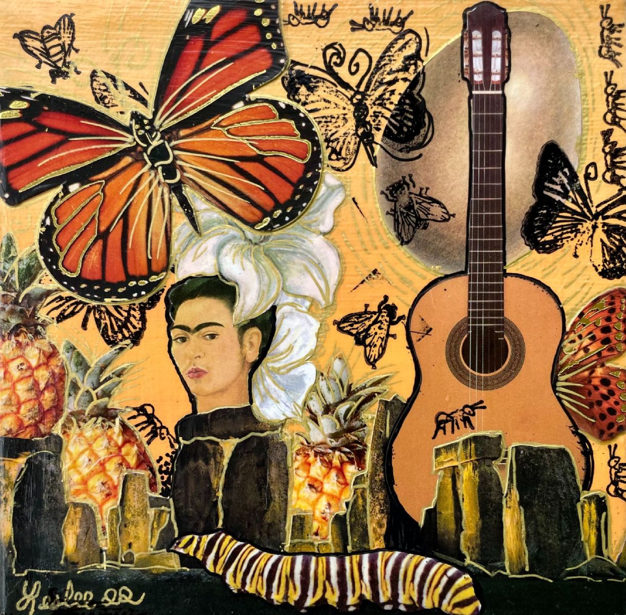 This mixed media collage features a dream about Frida Kahlo surrounded by a warm yellow-orange environment. I was searching art history books for subjects related to the background color I painted on the canvas. I quickly found this small image of Frida and naturally that led to butterflies and flowers floating above her. The Stonehenge image seemed to need an orange backgound. The egg is a planet that that represents new beginnings. The guitar represents harmony and peace. My dreams are filled with colors and music. Are yours?