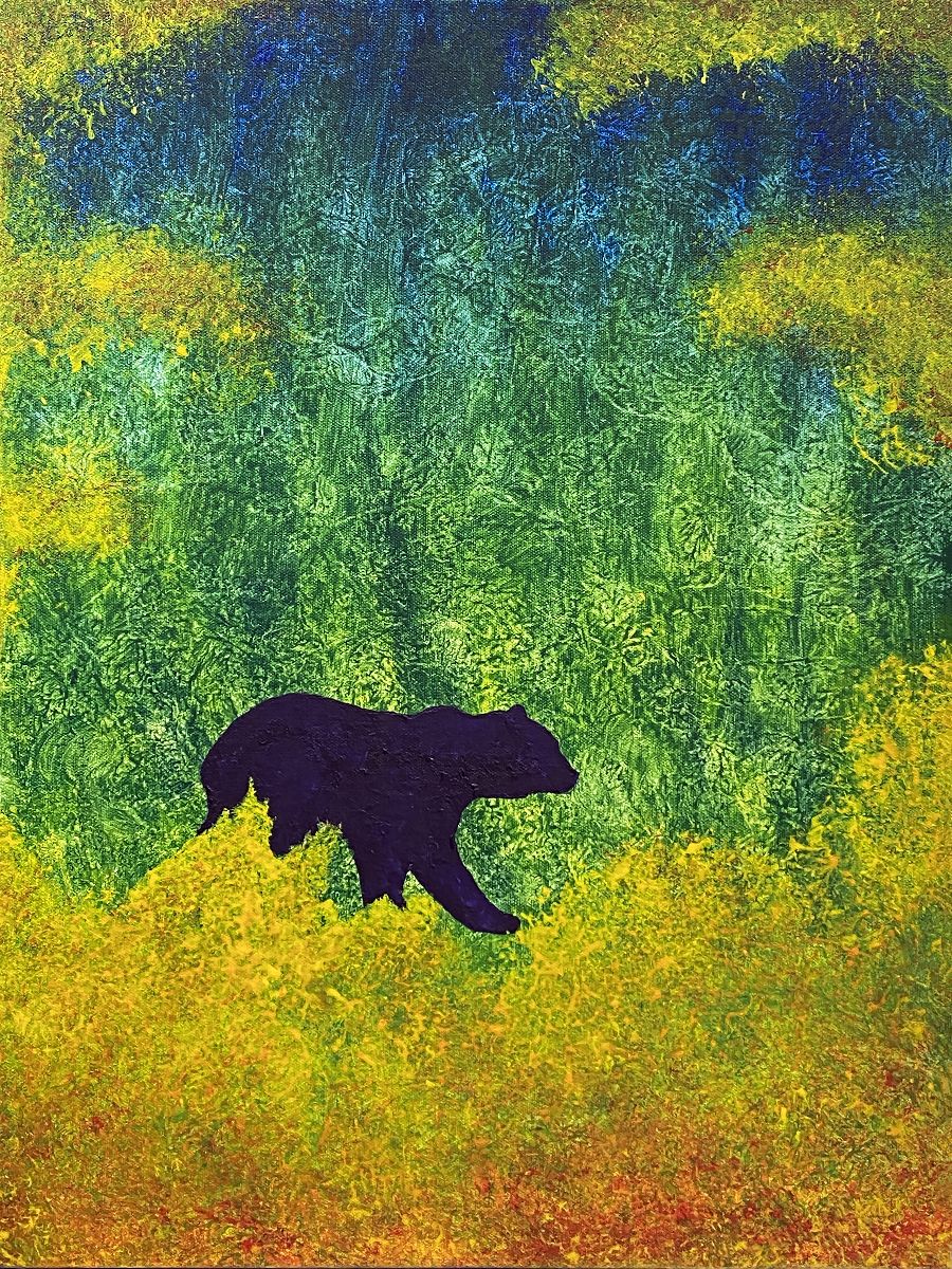 Acrylics an canvas. The subtle deep purple hue in the bear gives the final color needed to present the spectrum. Not shouting nor hiding either, just quietly there as the bear travels about life.